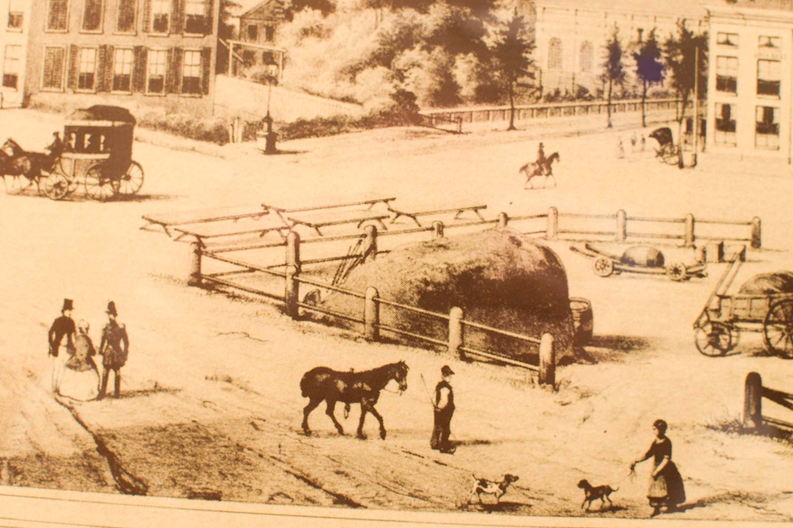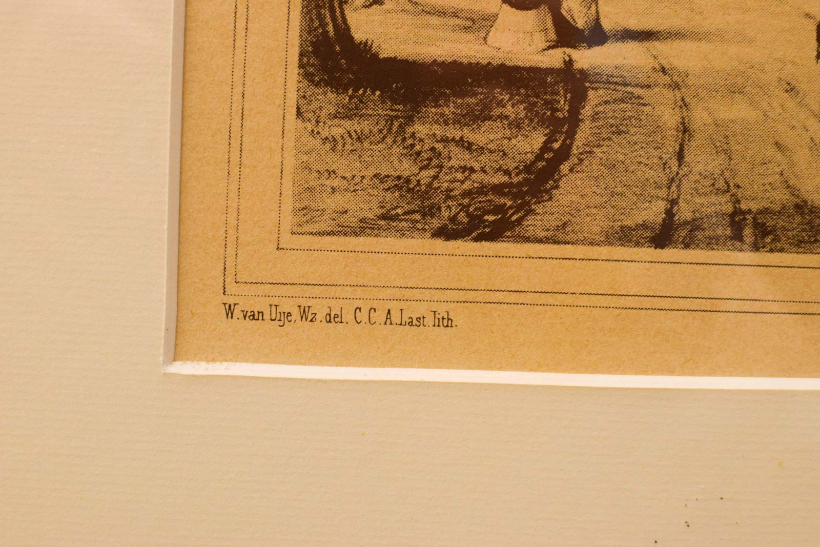 Deze antieke prent dorpsgezicht is een lithogrfisch werk van W. van Urje, uitgegeven door C.C.A. Lässt. Het beeld toont een levendig dorpsplein vol bedrijvigheid, met klassieke boerderijen, koetsen, ruiters en dorpsbewoners in 19e-eeuwse kledij. De prent is geteekend op getint papier en toont veel karaktervolle details: houten omheiningen, wagons, paarden en kleine figuren die het dagelijks leven van destijds weergeven.