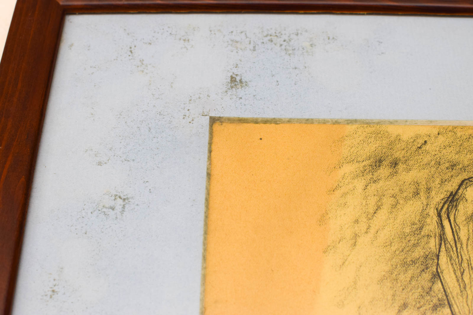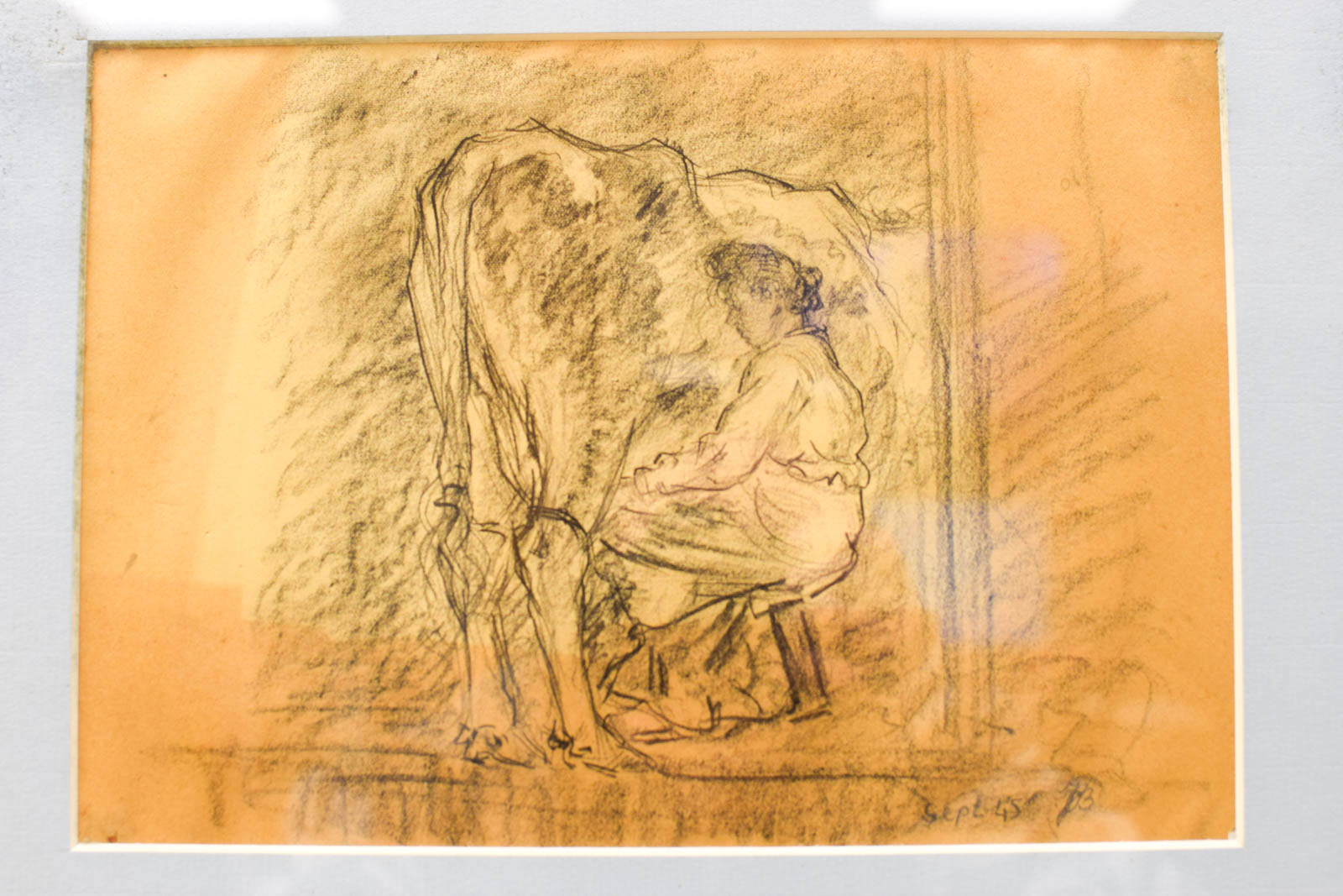 Authentieke oude prent met tekening van een boerin die een koe melkt. In houten lijst met gebruikssporen door leeftijd en vochtschade. Afmetingen 43 x 33 cm.