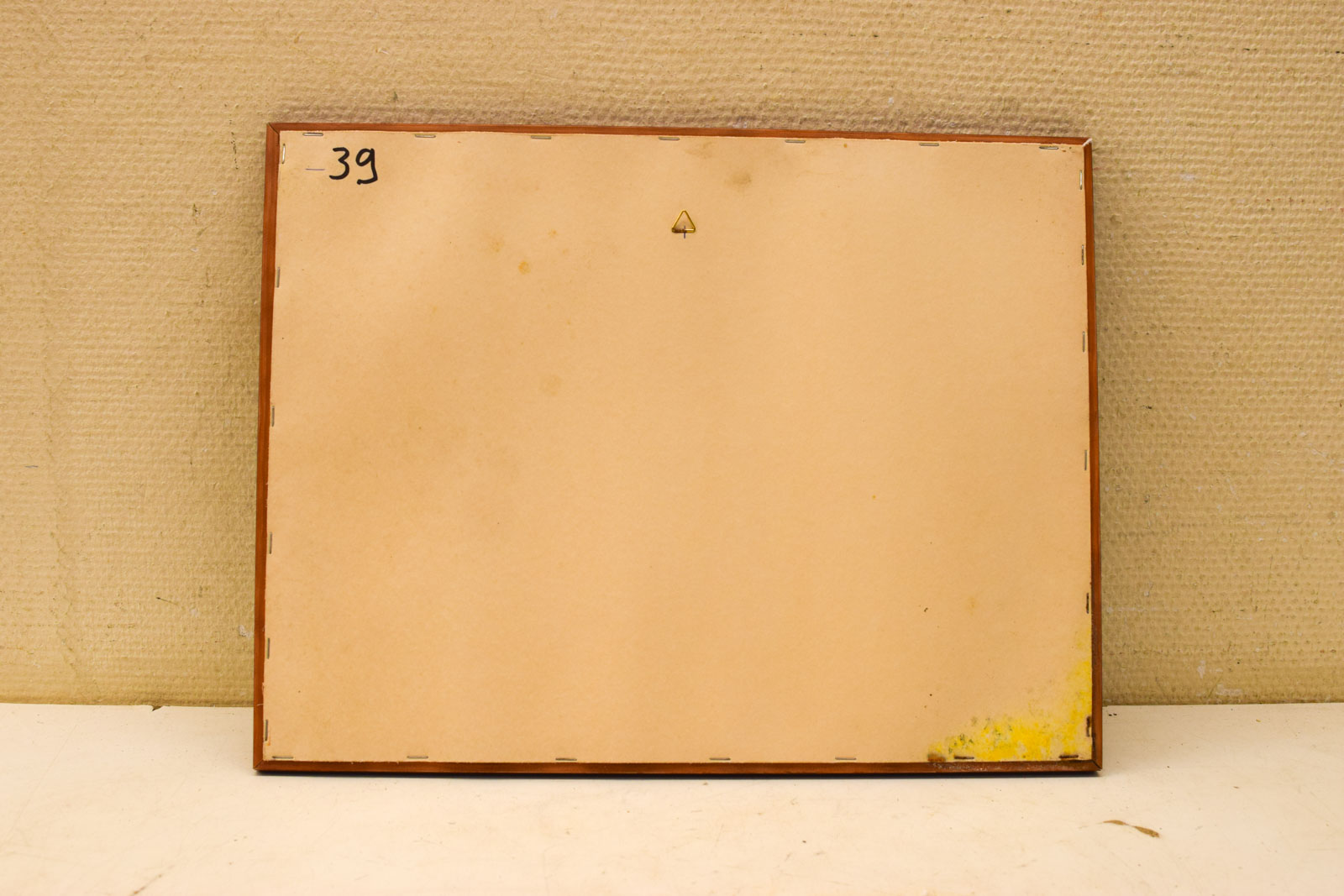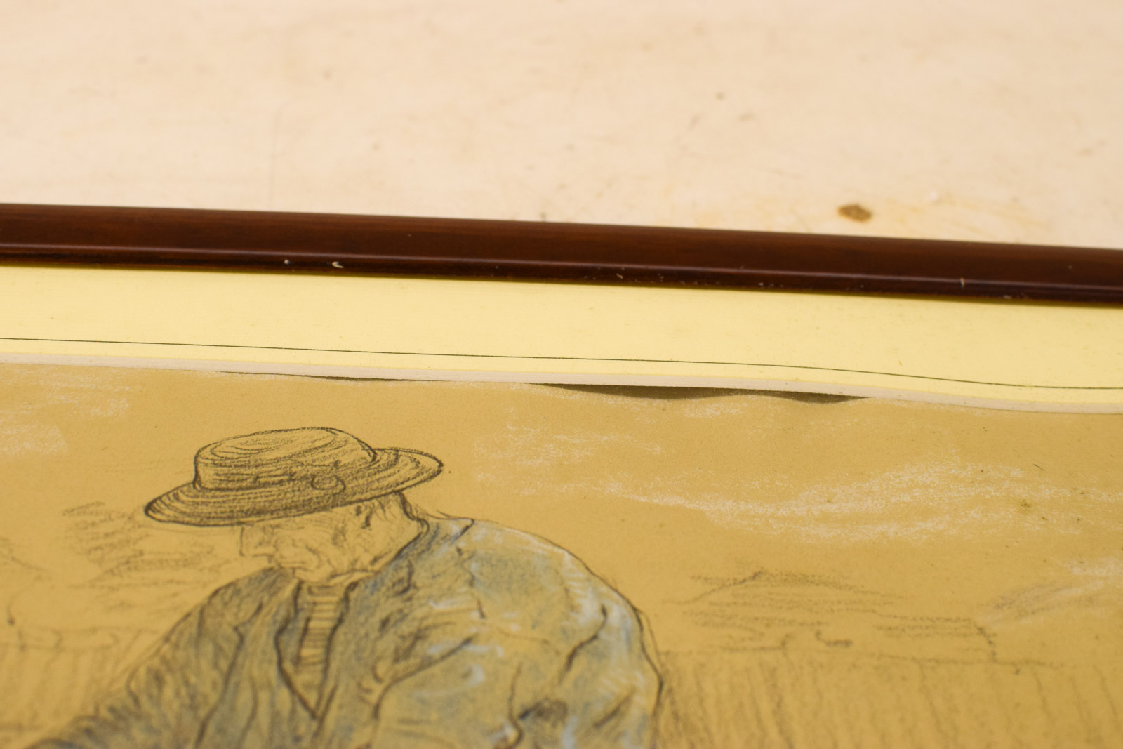 Vintage prent van een herder met zijn schaap in klassieke tekeningstijl. Komt in bruine houten lijst met geel passe-partout. Let op: verkleurd en vochtschade.