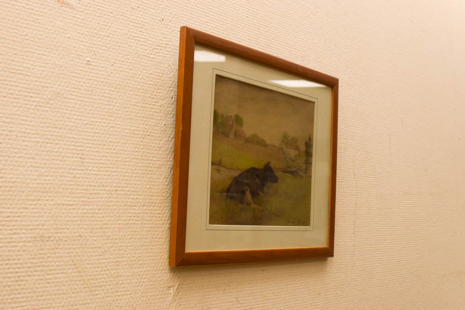 Afmetingen van het ingelijste geheel: breedte 43,5 cm, hoogte 33 cm, diepte 1 cm. Dit formaat past goed in de meeste interieurs en hangt comfortabel op ooghoogte. Voor verzamelaars van vintage dierenprinten of liefhebbers van nostalgische landelijke inrichting is dit een authentiek stuk met karakter.