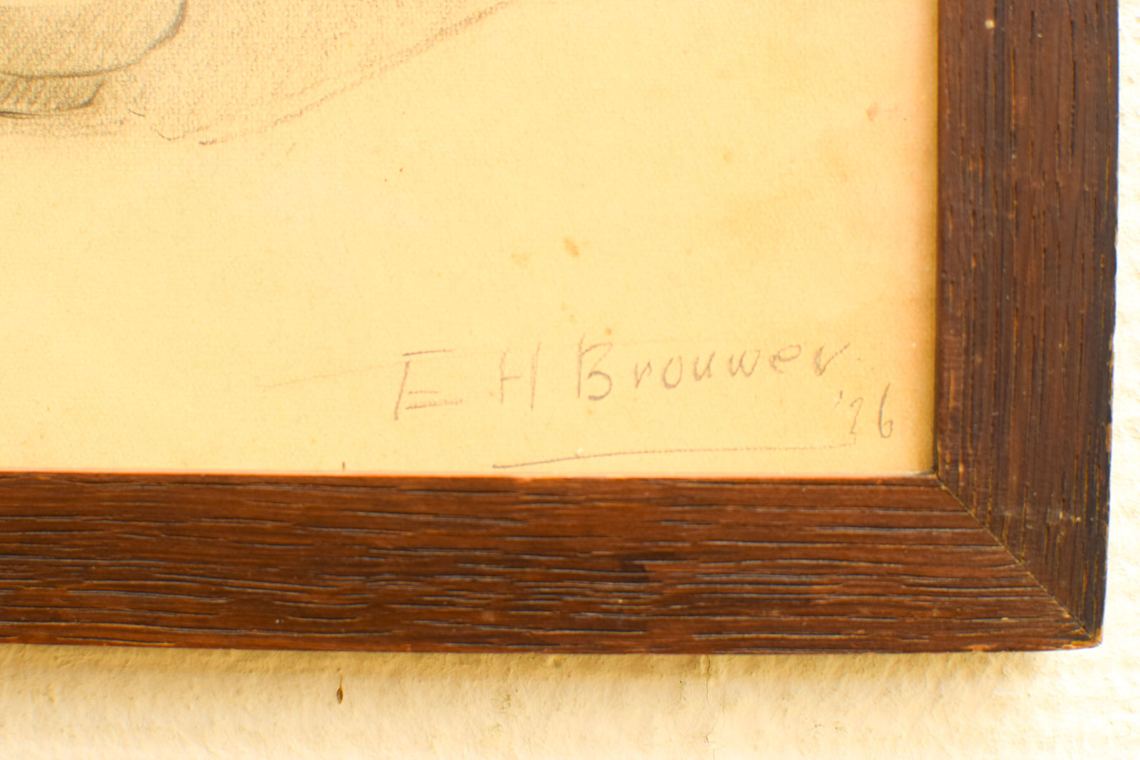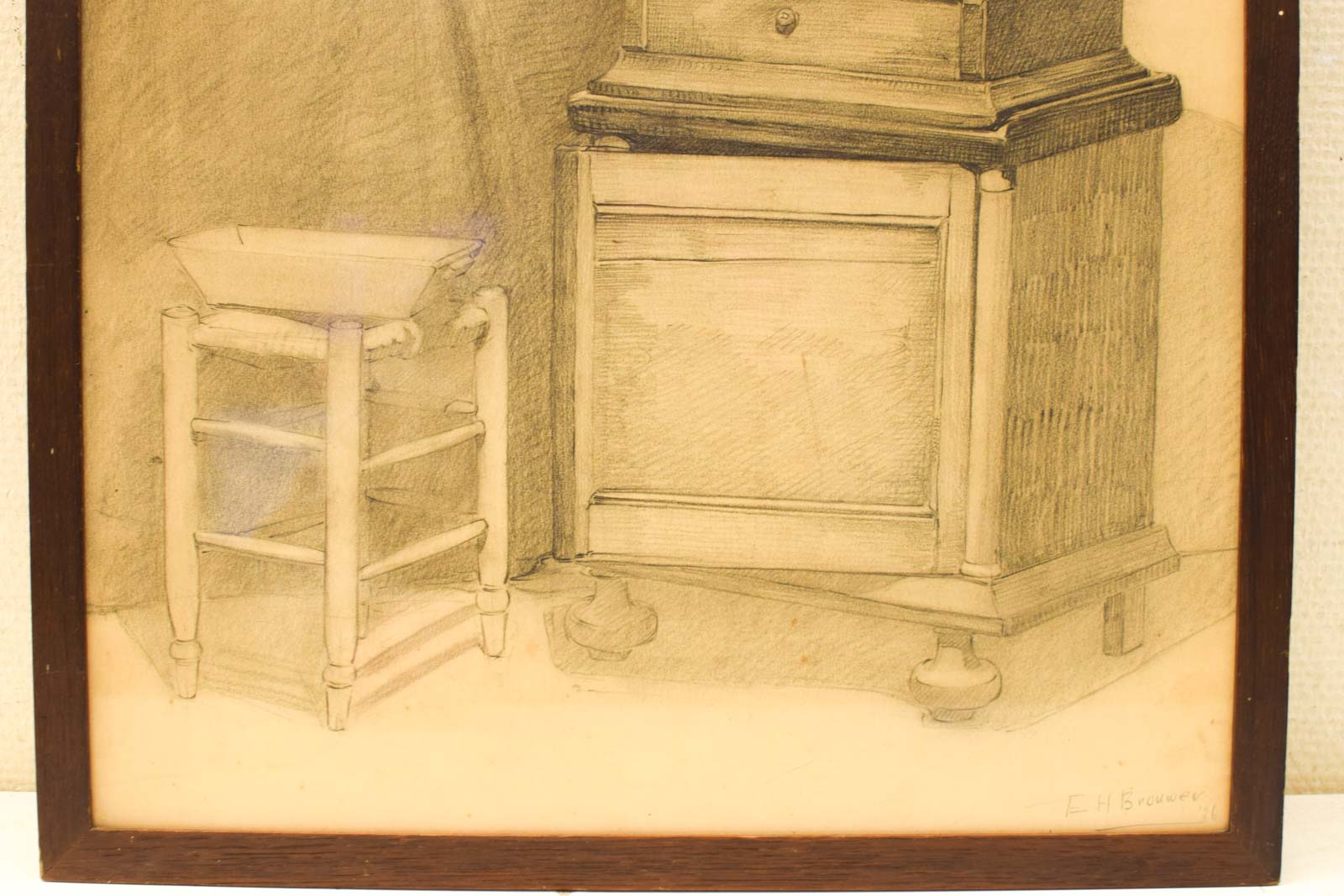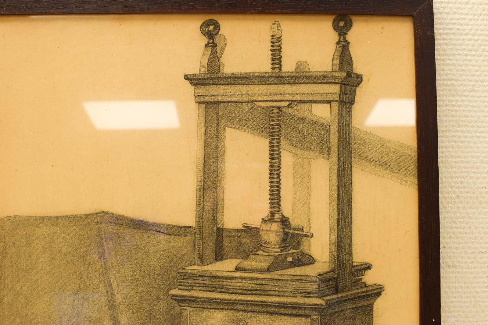 de lijst heeft lichte gebruikssporen de prent/tekening is verkleurd breed 45,5 cm