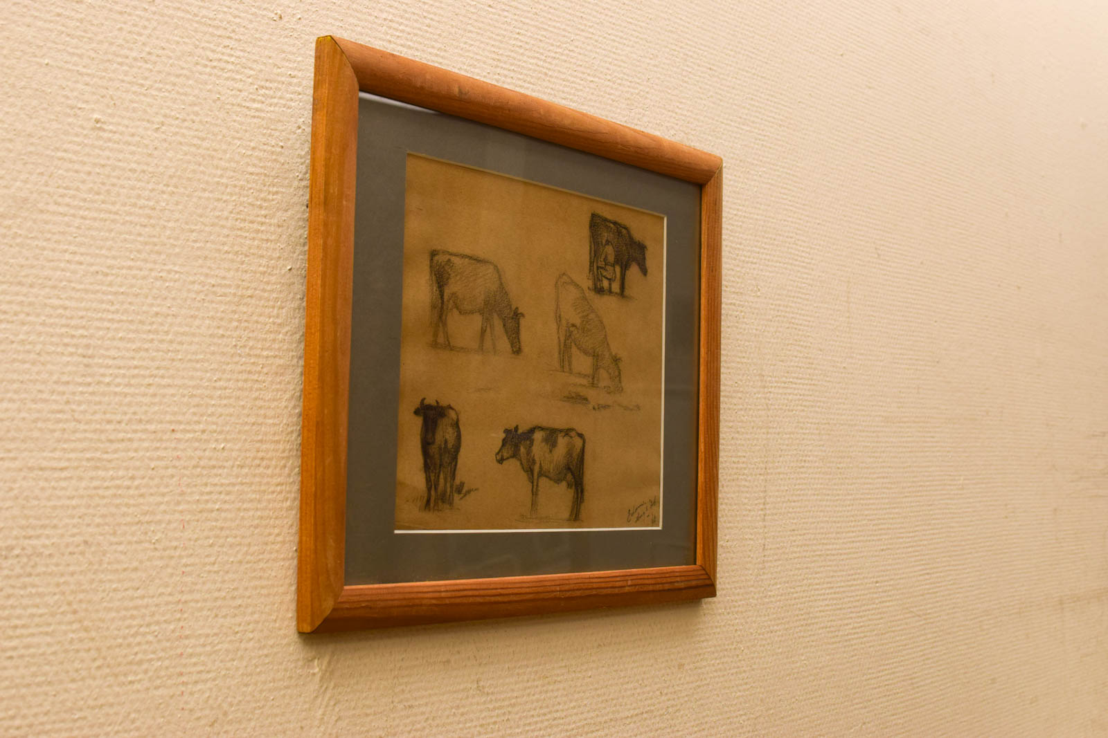 Dit is een vintage prent van getekende koeien in een houten lijst. De tekening bevat vijf verschillende studies van runderen, getekend in potlood op geelachtig papier. Je ziet onder meer een grazende koe, staande runderen en detail-studies van het dierenhoofden.