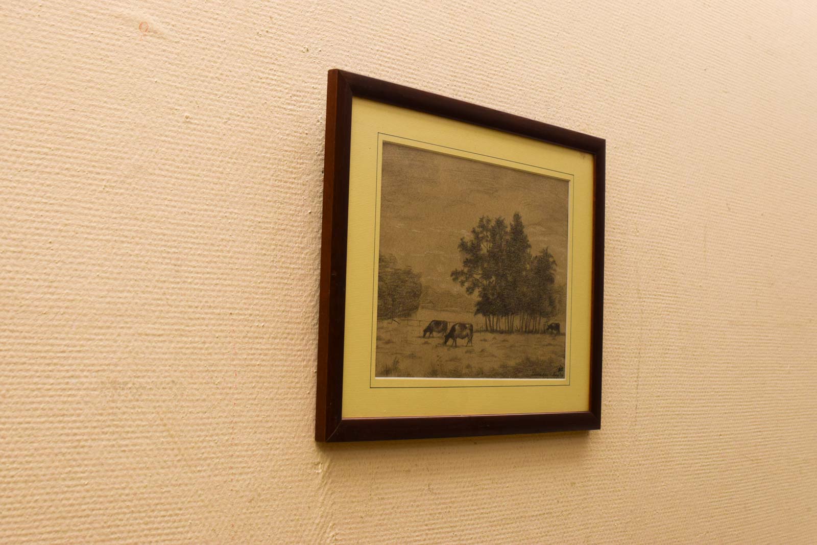 Deze ingelijste tekening van koeien in de wei is een landelijke prent die aandacht trekt met zijn rustieke uitstraling. De afbeelding toont koeien grazend in een open veld met bomen op de achtergrond, uitgevoerd in verfijnde potloodtechniek op papier. Het werk heeft een vogeloogperspectief dat veel diepte geeft aan de compositie.