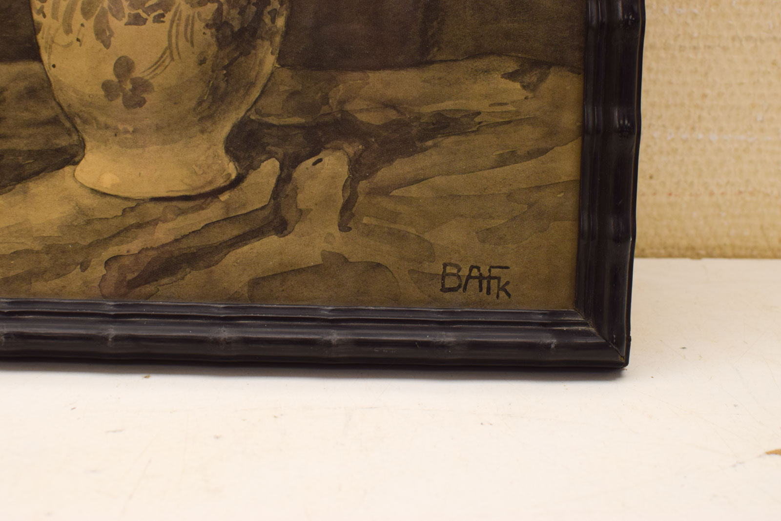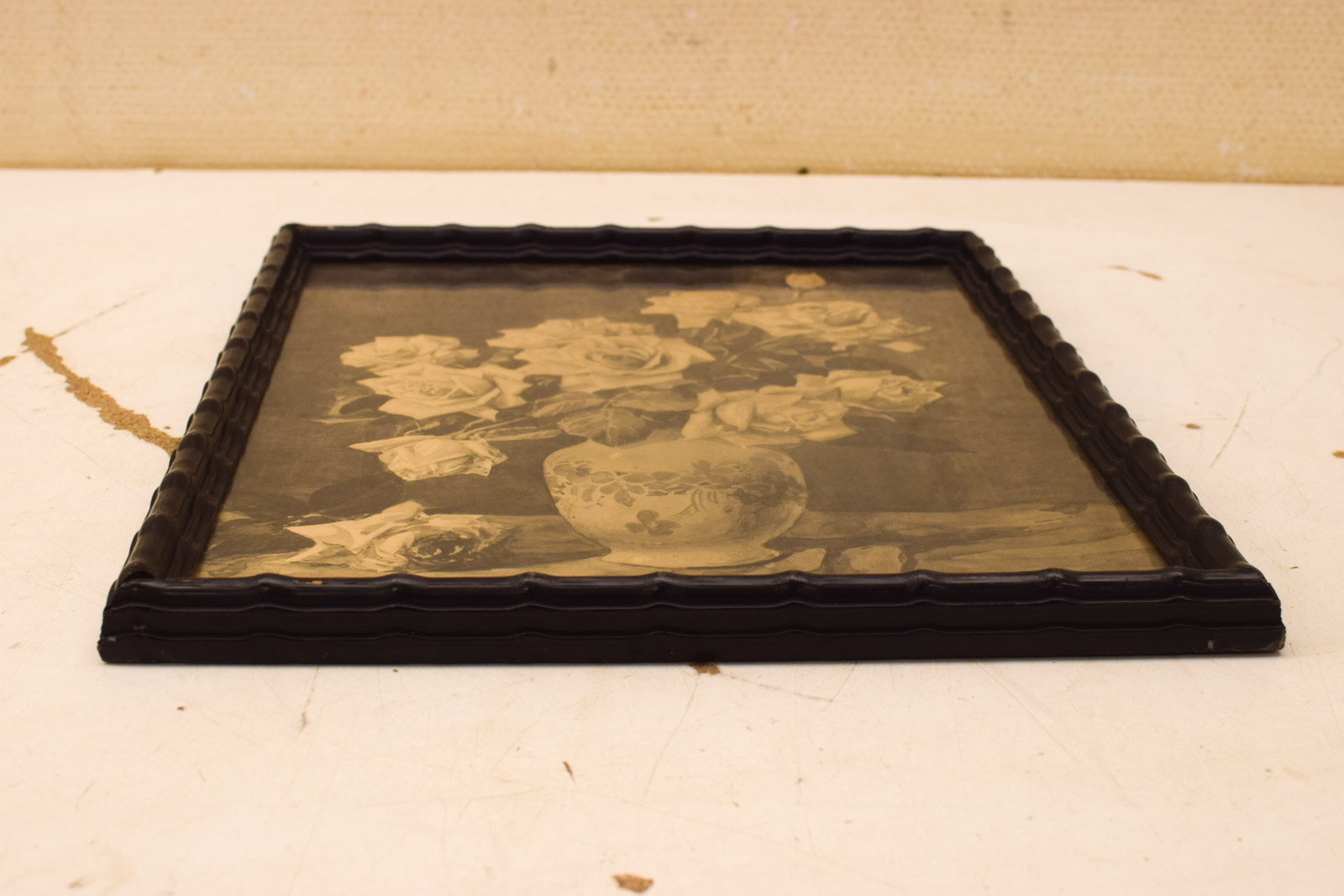 Deze vintage prent van rozen in een lijst is een charmant stuk voor wie van klassieke bloemmotieven houdt. De prent toont een volle vaas met rozen in sepia- en crèmetinten tegen een donkere achtergrond. De kunstenaar BARK heeft het werk gesigneerd in de hoek. Het werk is gemonteerd in een zwarte houten lijst met decoratief profiel, afmetingen 32 cm breed en 40,5 cm hoog.