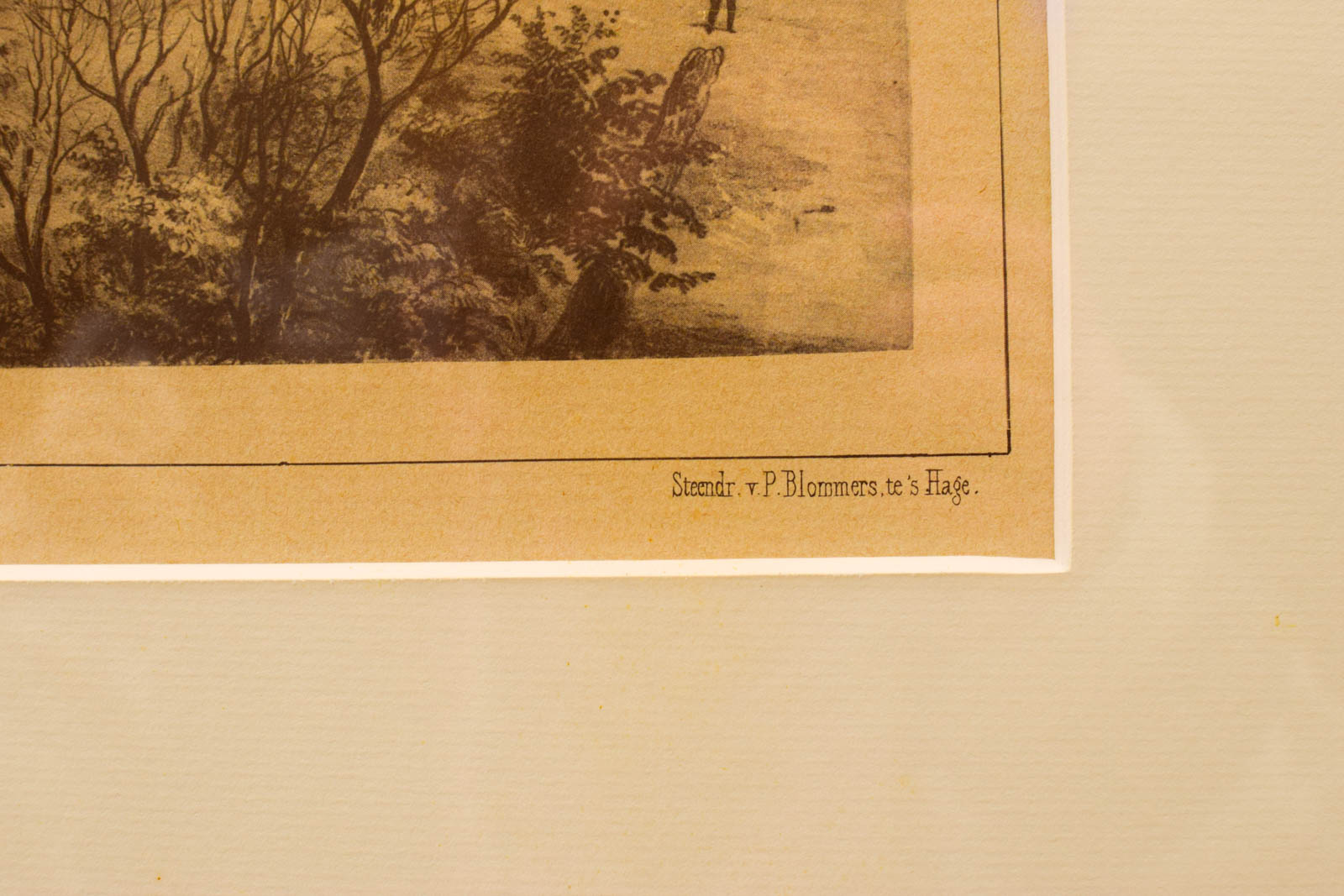 De staat: de prent is verkleuurd, wat natuurlijk is voor papierwerk van deze leeftijd. Het heeft lichte gebruikssporen passend bij de ouderdom. De afmetingen zijn 61 cm breed en 45,5 cm hoog, inclusief het montagewerk.