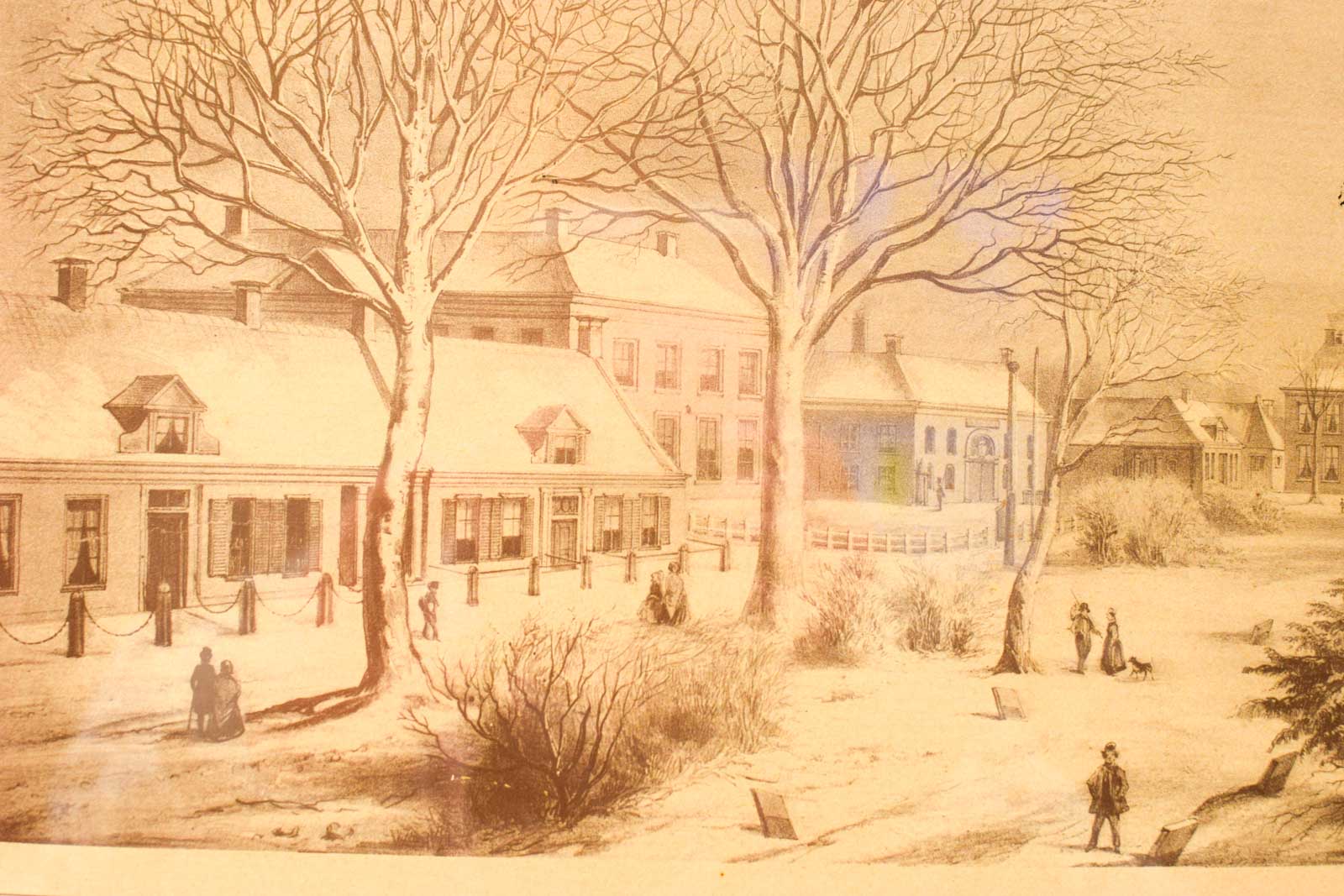 Deze winterlandschap prent is een fraai voorbeeld van klassieke Nederlandse prenten. De afbeelding toont een winters dorpsplein met karakteristieke gebouwen, kale bomen en figuren in negentiende-eeuwse kledij. De prent is voorzien van een zandkleurige passe-partout met gouden binnenrand en donkerbruine houten lijst, wat een traditioneel en elegant geheel vormt.