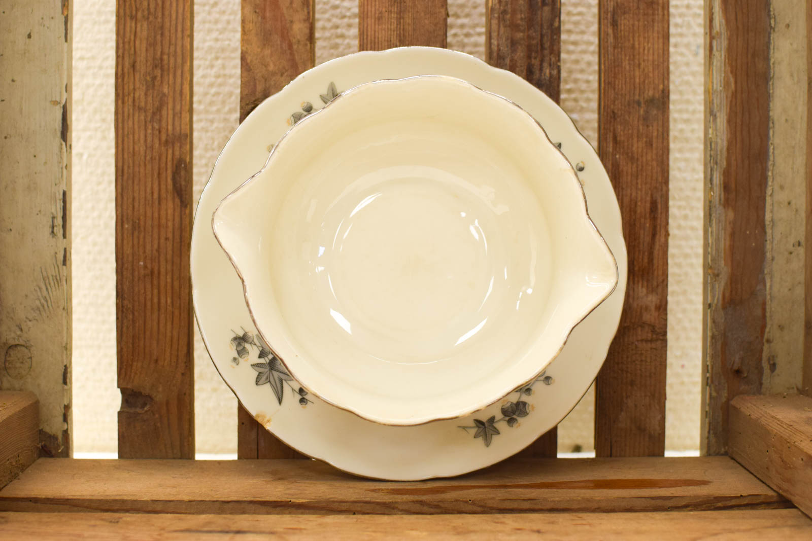 Vintage Puls porseleinen sauskom met vast schoteltje. Mooie gebloemde decor in grijs. Heeft enkele gebruikssporen, maar volledig intact.