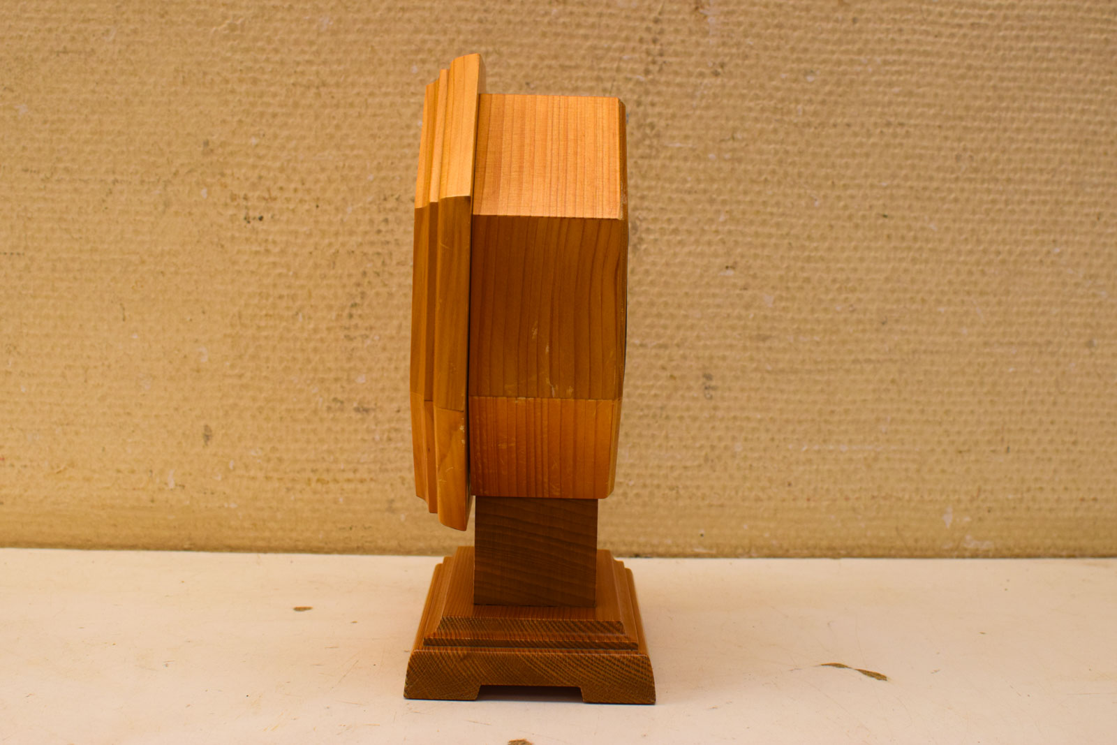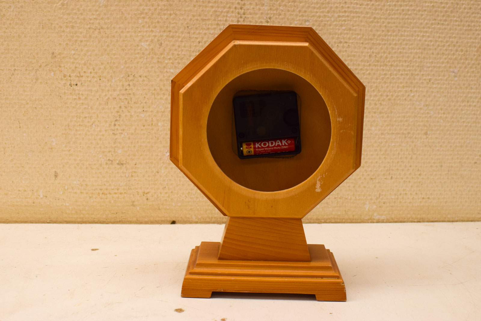 Het hout vertoont lichte gebruikssporen, wat je van een tweedehandsstuk mag verwachten. Het klokje loopt goed en doet zijn werk zonder problemen. Ideaal als je een werkend klokje zoekt dat tegelijk een decoratief element is.