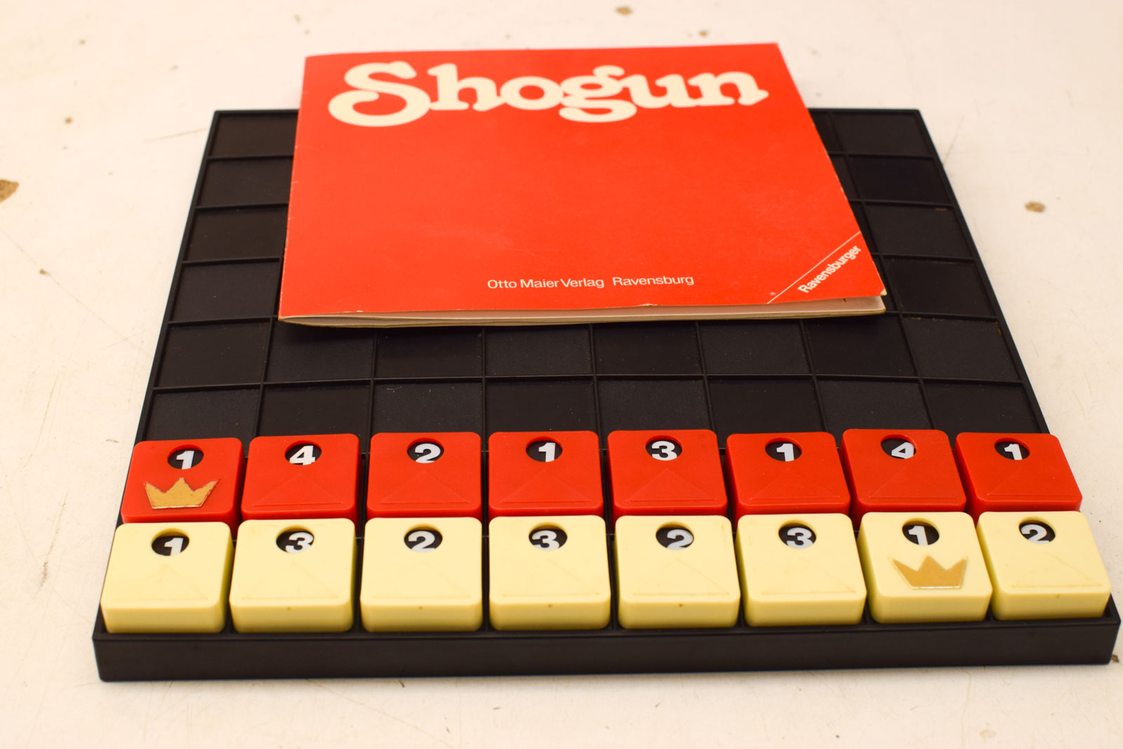 Dit is Ravensburger Shogun, een bordspel uit de jaren 1980 met een uniek speelmechanisme. Het spel wordt gespeeld met zogenaamde automatic stenen: bij elke zet verandert het getal op de stenen automatisch, wat het spel onvoorspelbaar en strategisch interessant maakt. Je bent constant aan het rekenen en anticiperen op wat de stenen straks zullen tonen.