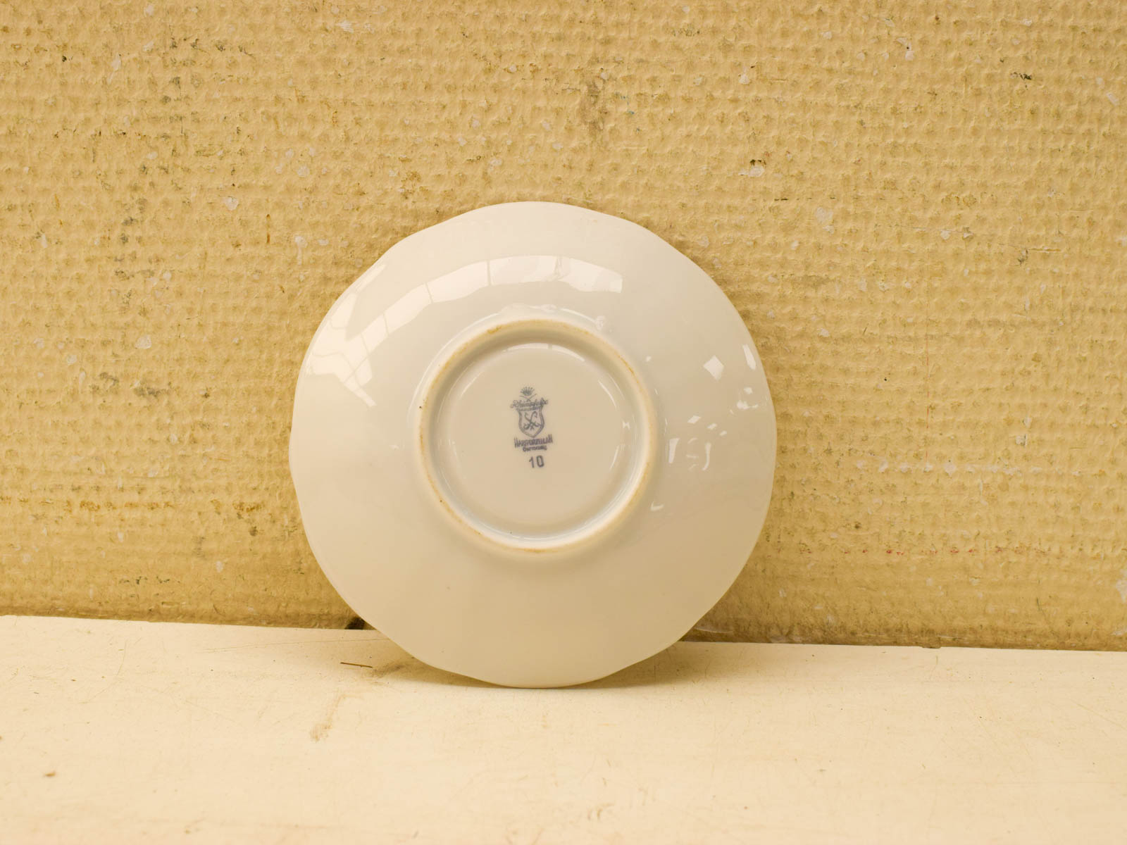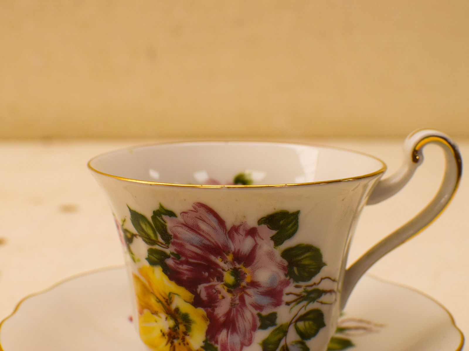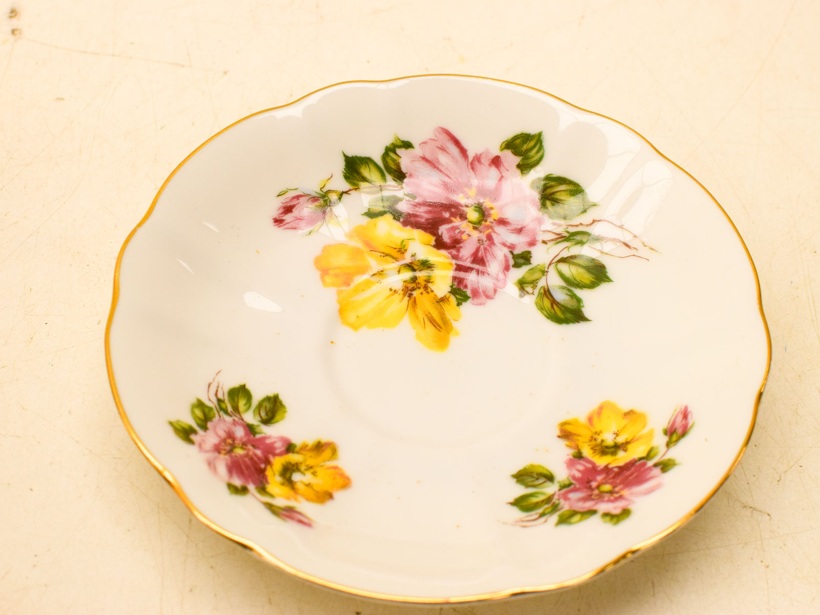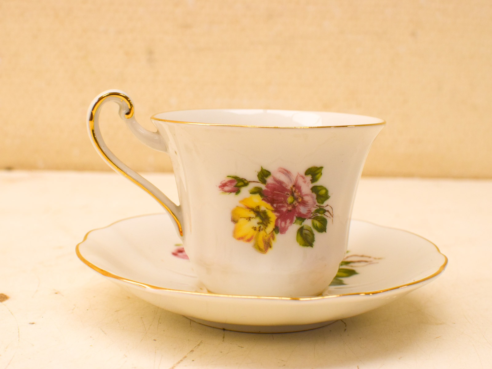 Mooie vintage Rheinpfalz porseleinen kop en schotel met bloemenprint in roze en geel. Met gouden rand en elegant handvat. Het kopje toont gebruikssporen op het decor.