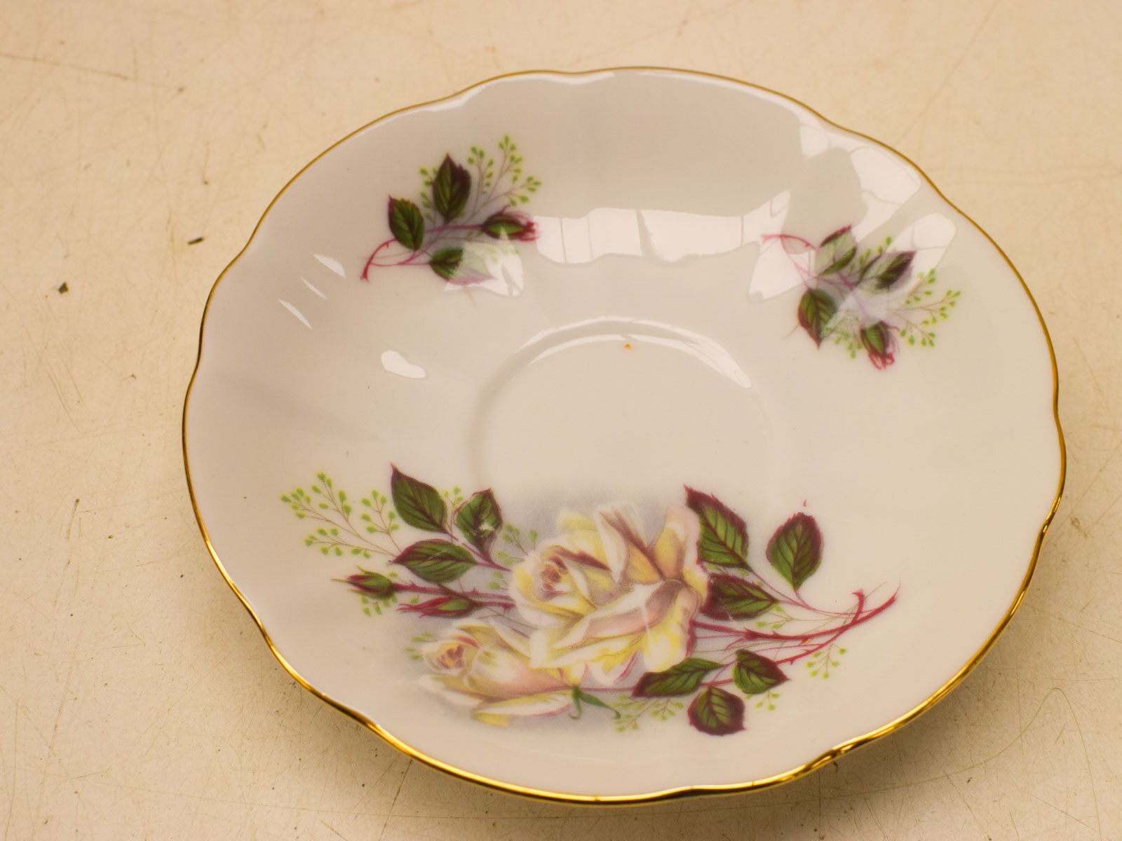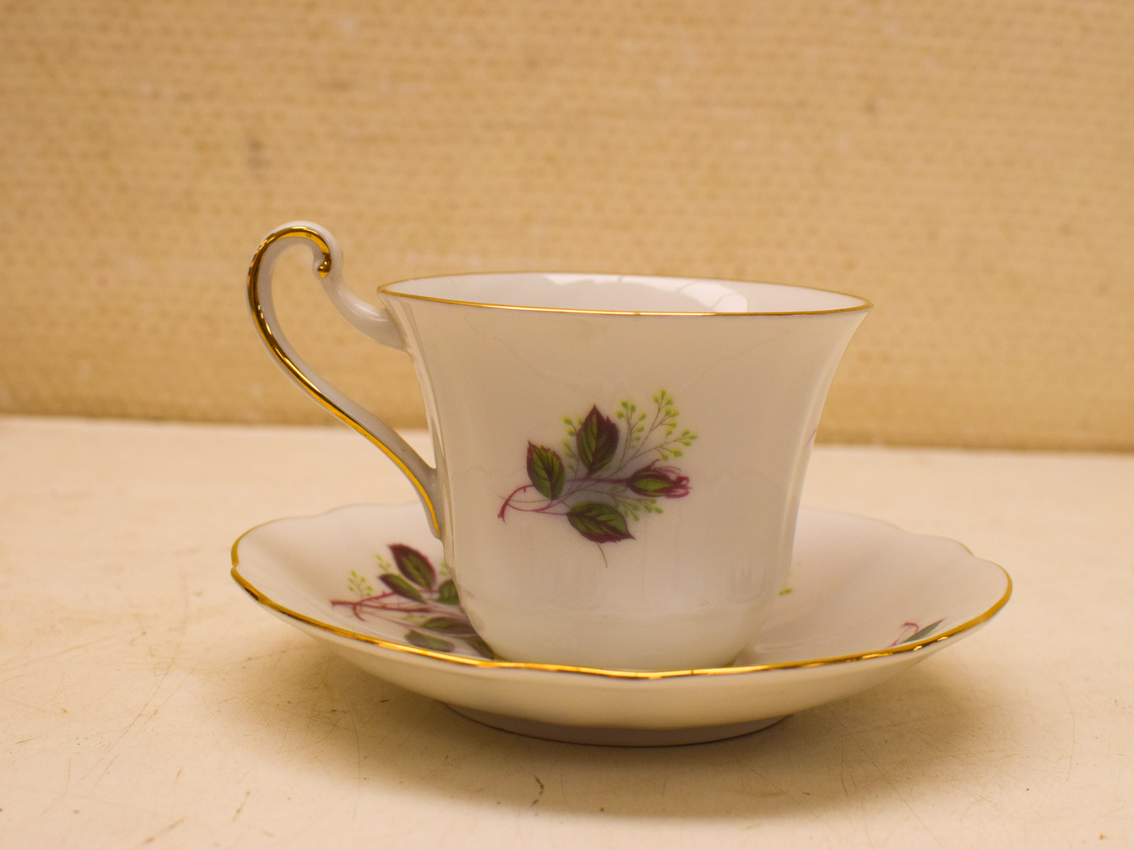 De staat is redelijk. Je ziet hier en daar gebruikssporen van een leven in gebruik, maar het porselein zelf is intact en functioneel. De gouden lijnen vertonen normale slijtage. Dit is typisch voor serviesgoed van deze leeftijd en voegt juist authentieke karakteristiek toe.