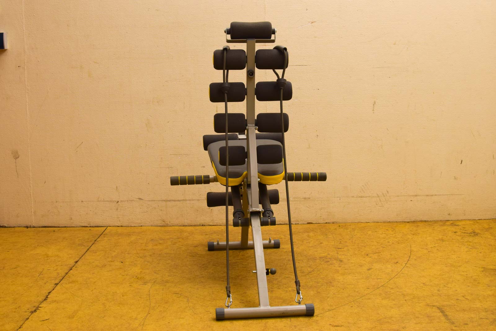 Het apparaat toont gebruikssporen die passen bij een tweedehands fitnessapparaat. De rollen en steunpunten zijn volledig aanwezig en de constructie lijkt stabiel. De gele accenten op de handgrepen geven goed contrast. Dit is een praktische oplossing voor intensief buikspierentraining zonder veel ruimte in te nemen.