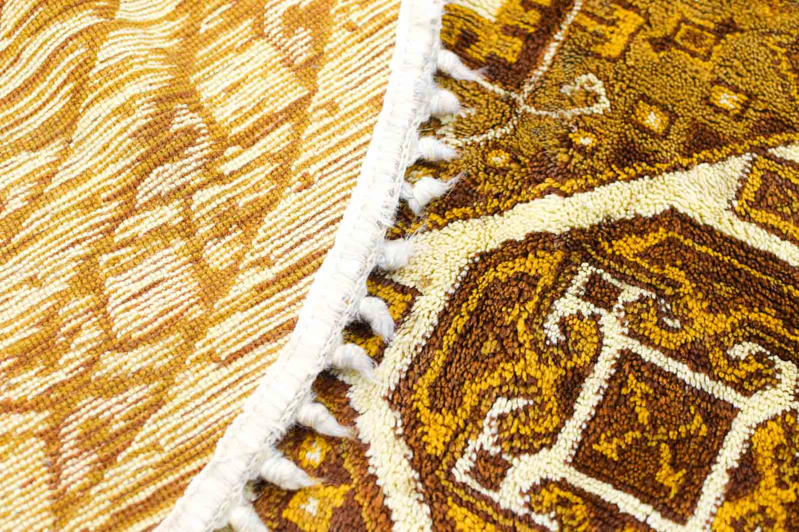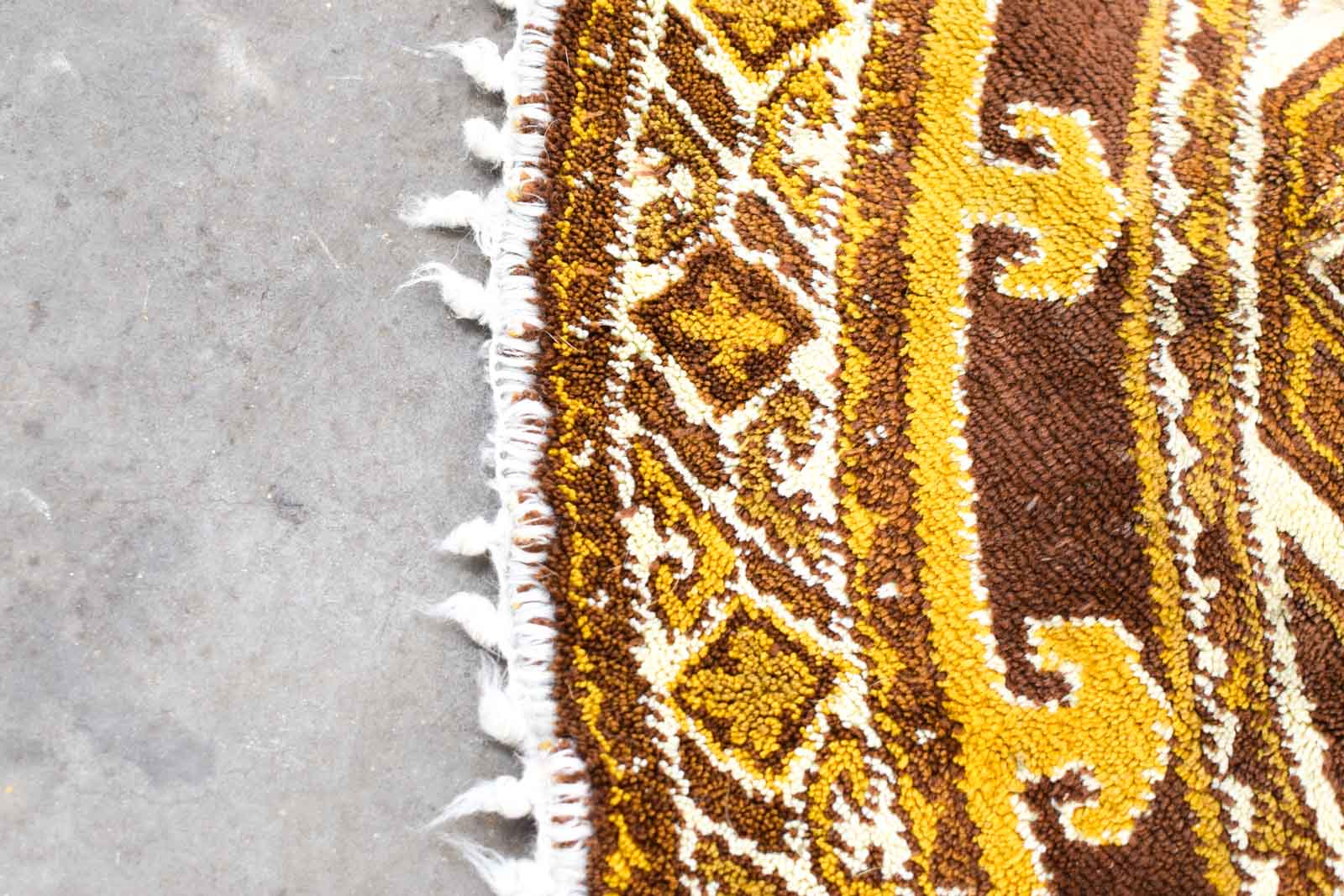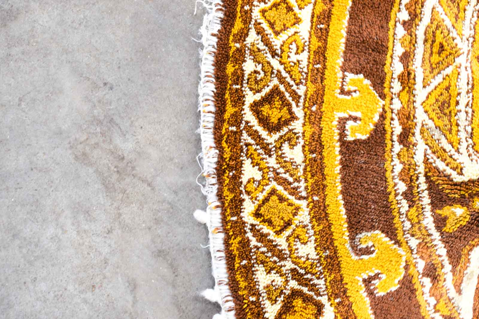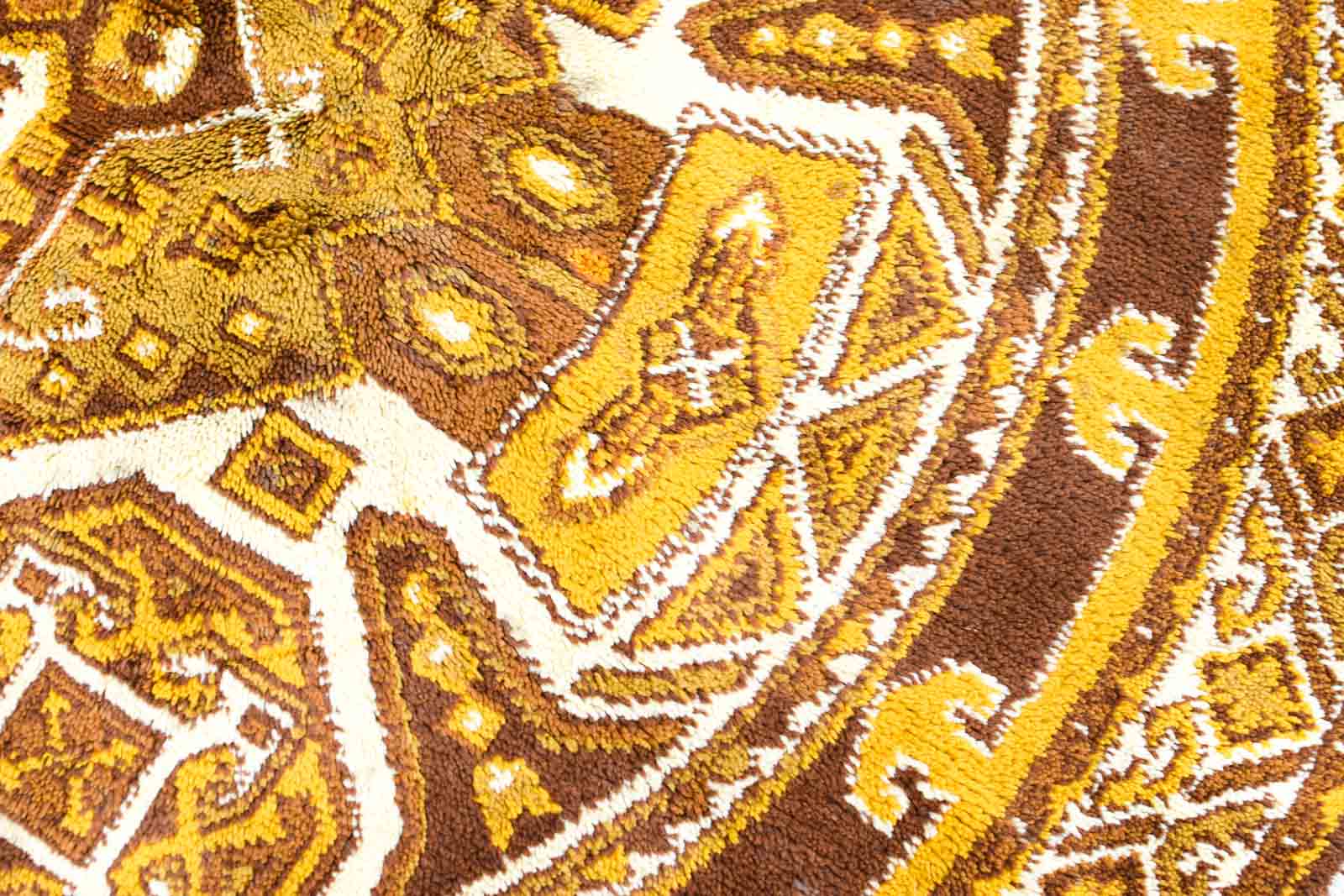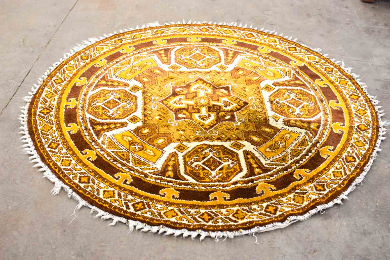 de kwasjes hebben gebruiksporen missen draadjes kleur van het kleed bruin/ geel gemeten zonder de kwastjes diameter 130 cm het kleed heeft vlekken