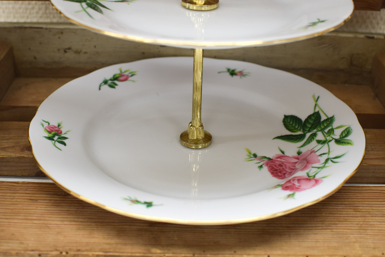 sfeervolle tweelaagse etagère van fijn rose porselein,
