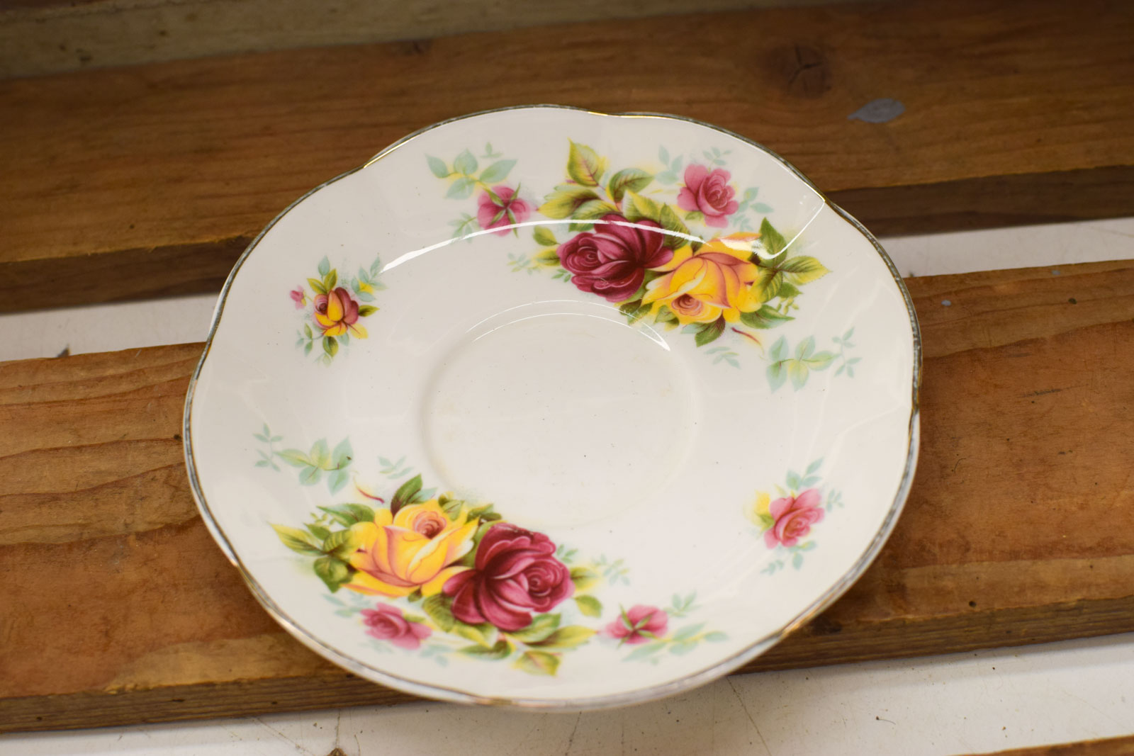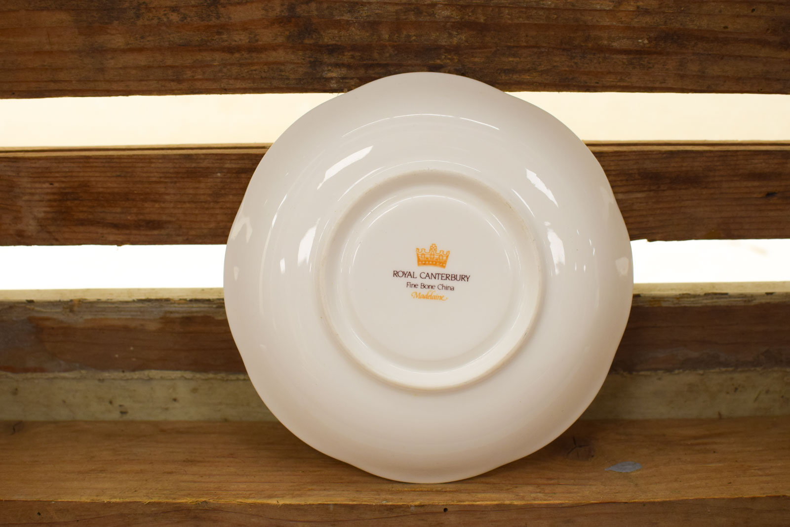het kopje gemeten diameter bovenkant opening 8 cm hoog 6 ,5 cm diameter van het schaaltje 13 cm heeft slijtage aan het geverfde randje heeft krasjes