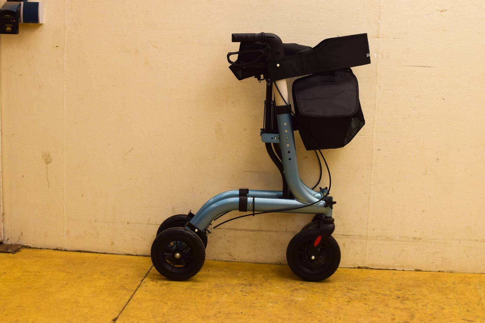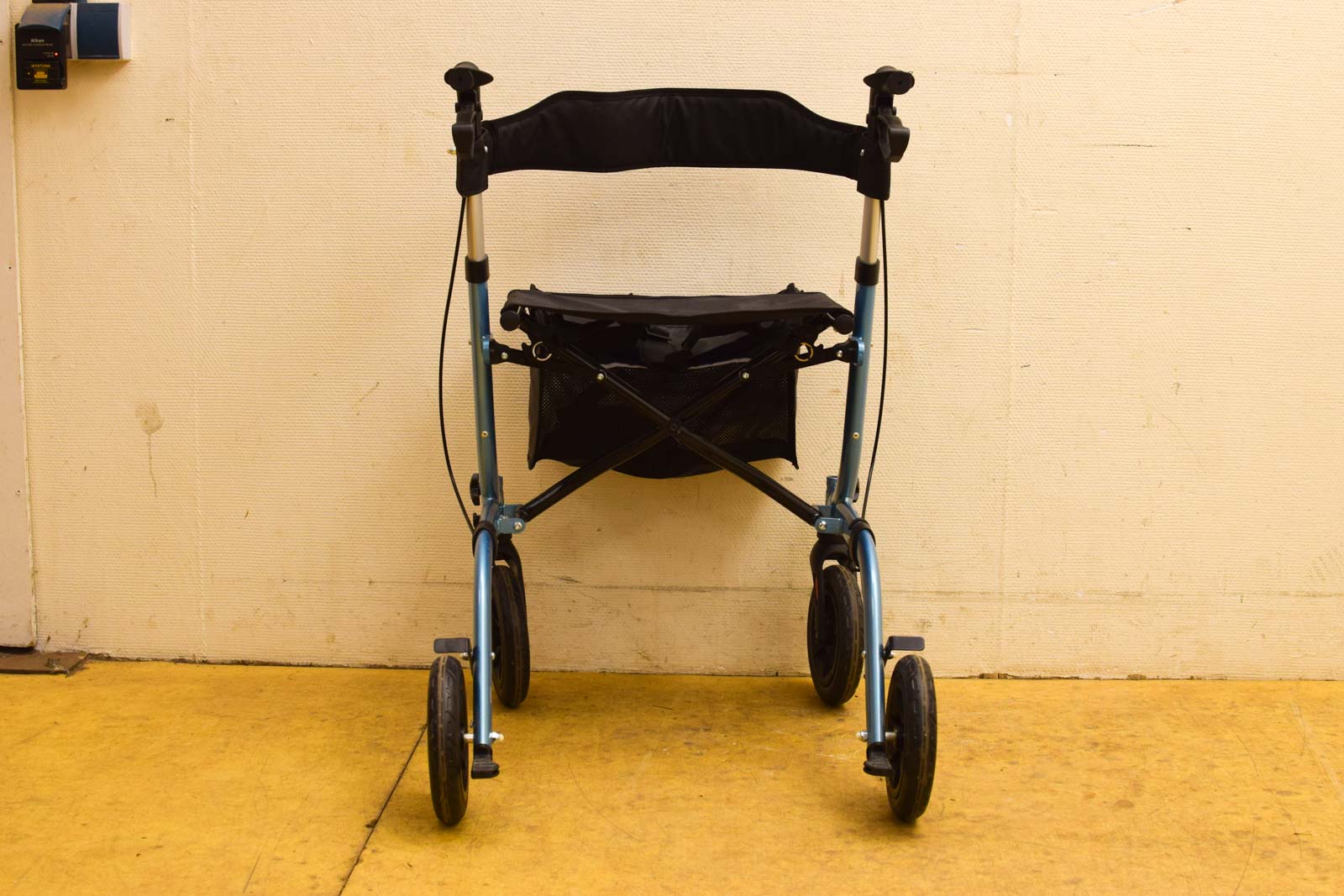 kleur is lichtblauw de rollator is inklapbaar de handvaten zijn in hoogte te verstellen de remmen mogen nog even nagekeken worden