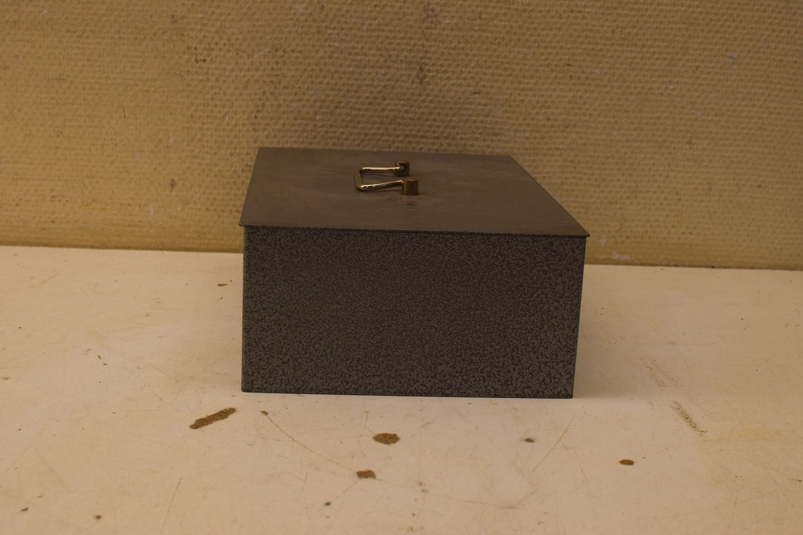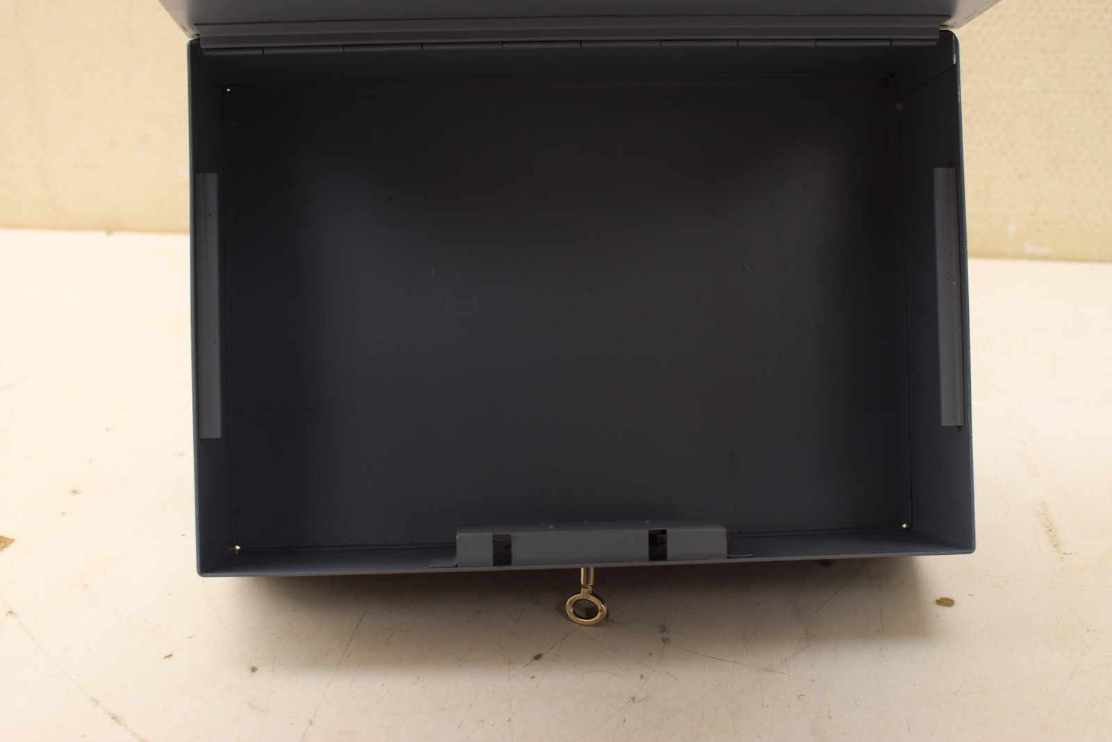 is een sleutel bij het geldkistje is gebruikt en heeft gebruikssporen de deksel van de kistje gaat stroef openen dicht diepte 20,5 cm breed 29,5 cm hoog 10 cm
