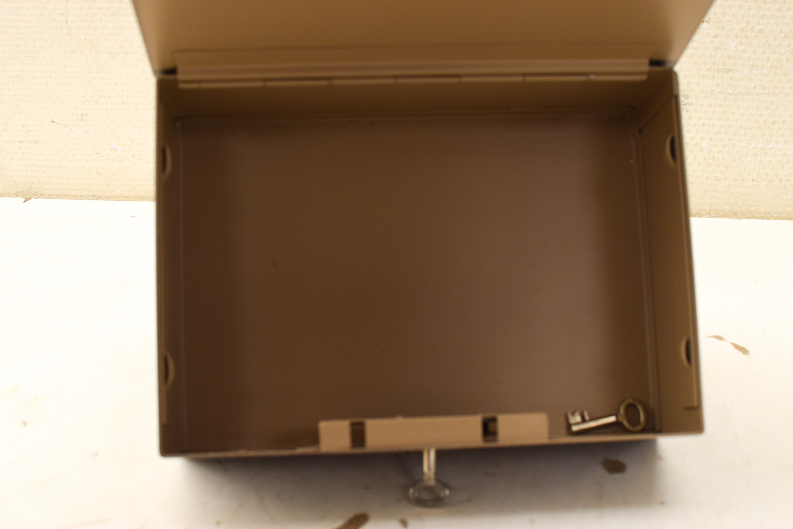 is een sleutel bij het kistje de deksel gaat stroef open en dicht breed 24,5 cm diepte 17,5 cm hoog 8 cm