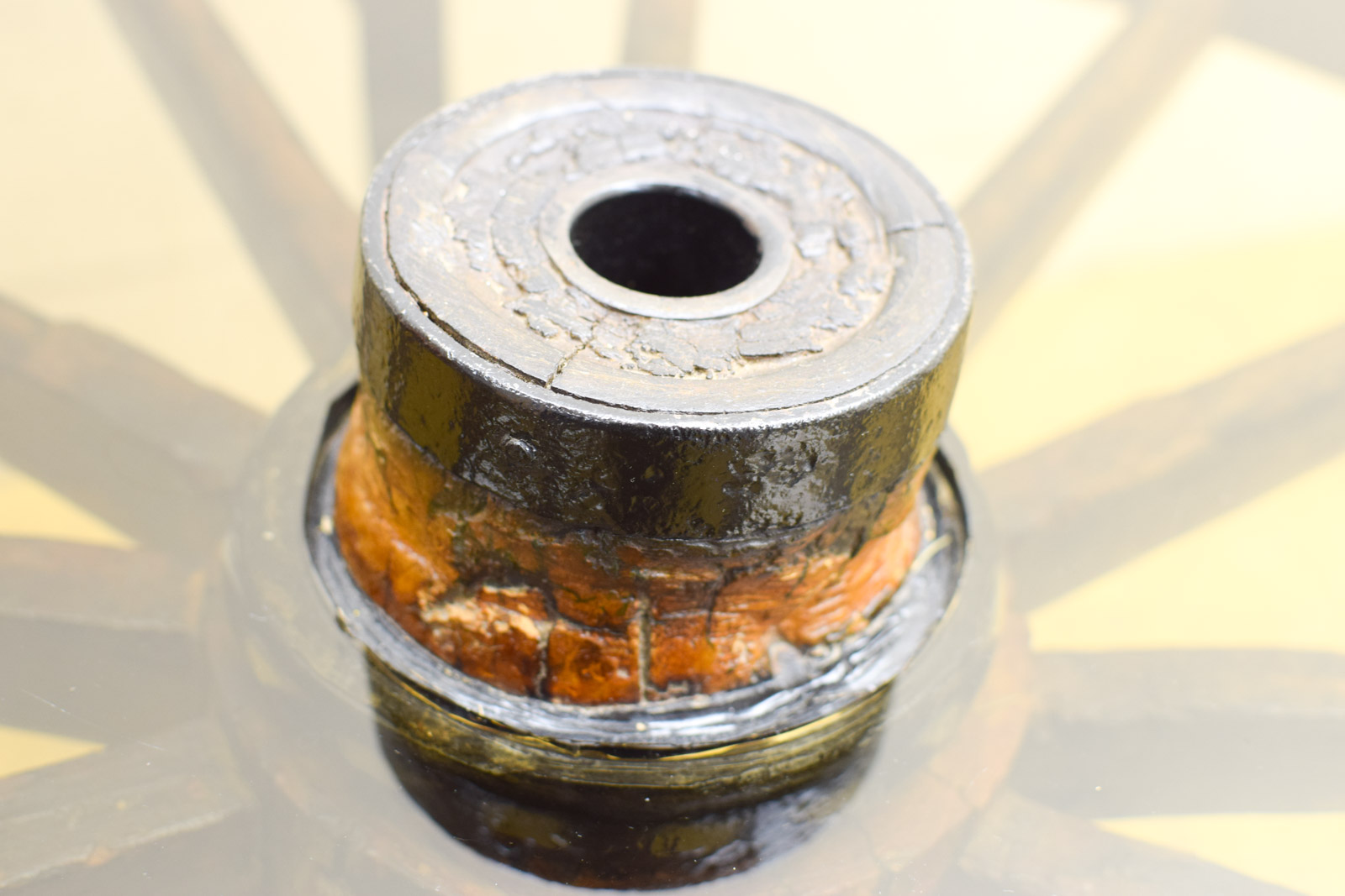 de glasplaat heeft krassen en vlekken de stuur is van hout de onderstel van gietijzer diameter 105 cm hoog 53,5 cm