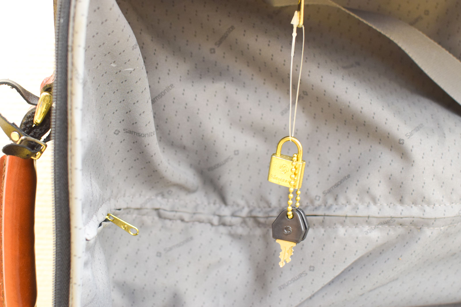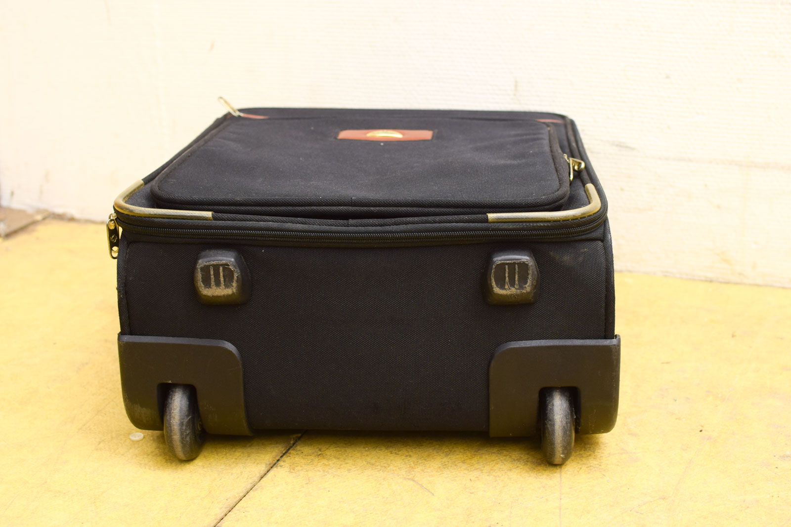gemeten met hendel hoog 104 cm zonder hendel hoog 47 cm de koffer is gebruik en is van stof heeft wieltjes onder