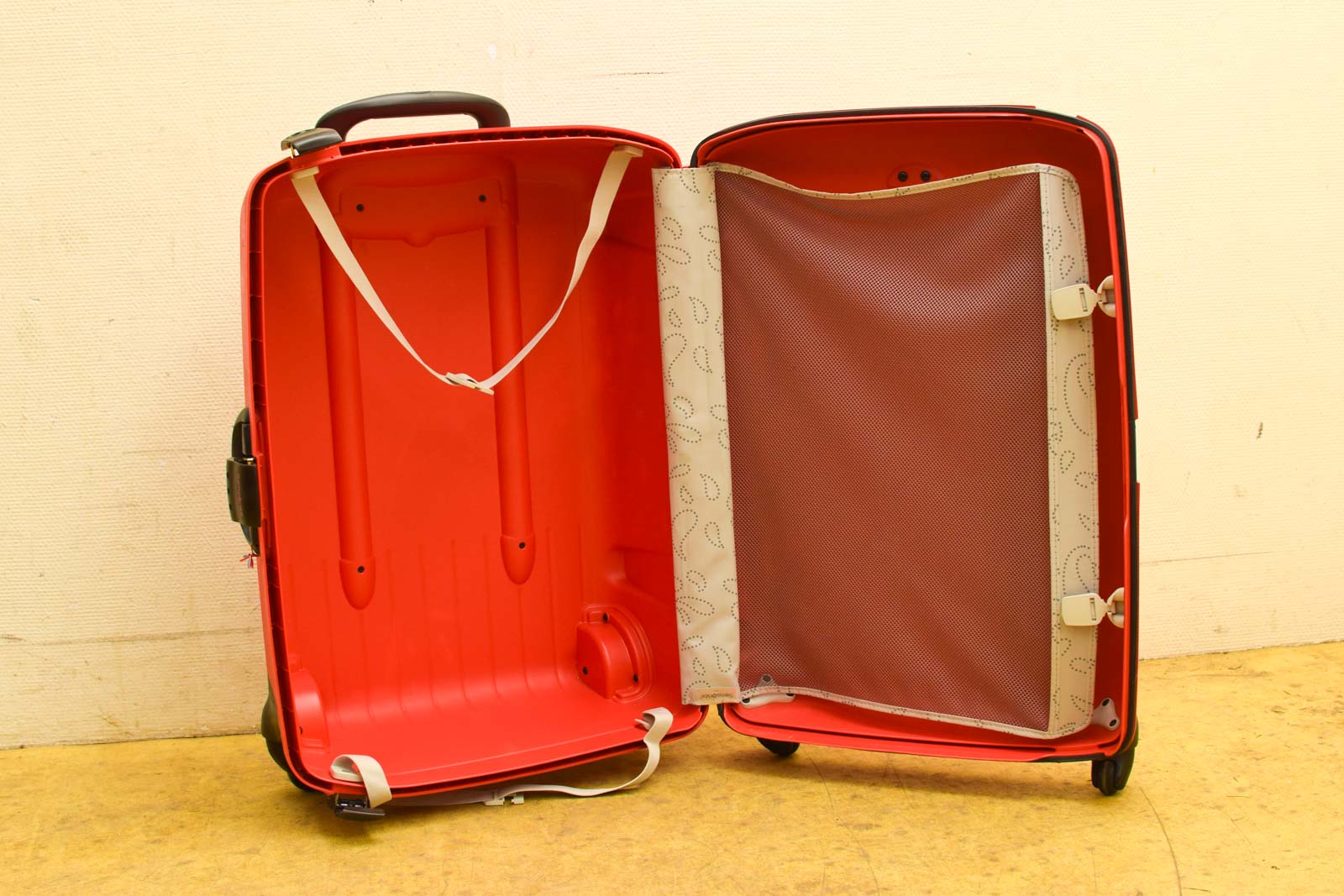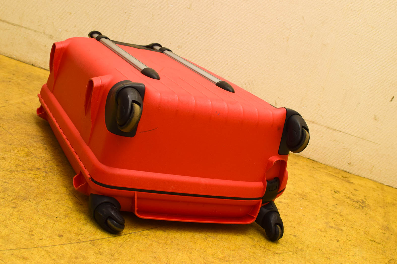 gemeten met hendel hoog 107 de koffer is van plastic en heeft krassen de koffer heeft 4 wieltjes onder