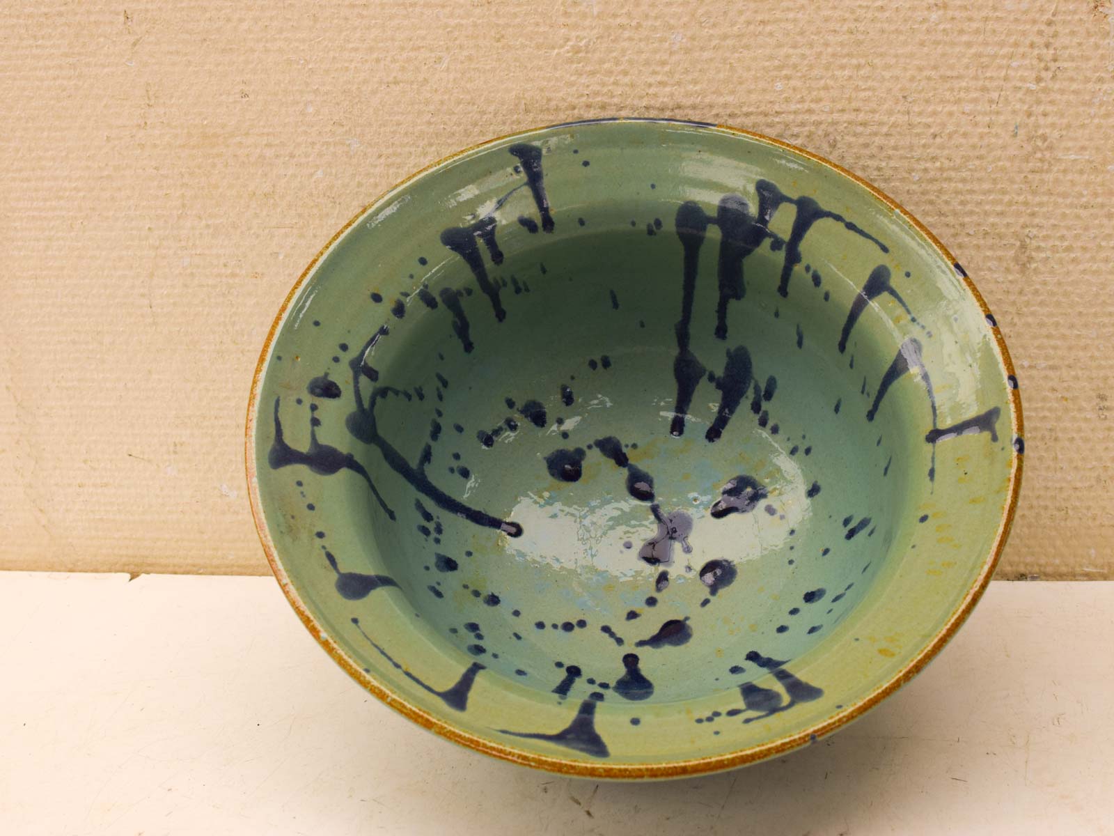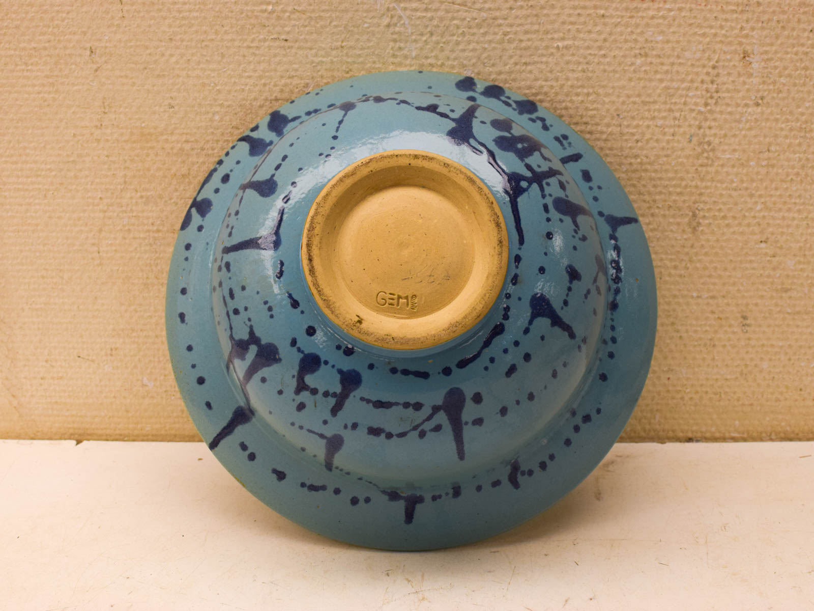 Op de bodem staat het merk GEHE gestempeld. Het aardewerk is kwalitatief goed, de schaal voelt solide aan en heeft geen scheuren of barsten. Wel heeft hij enkele lichtere vlekken op de glasuur, zoals je op de foto’s kunt zien. Dit geeft juist het authentieke, handgemaakte karakter dat veel mensen waarderen in keramiek.