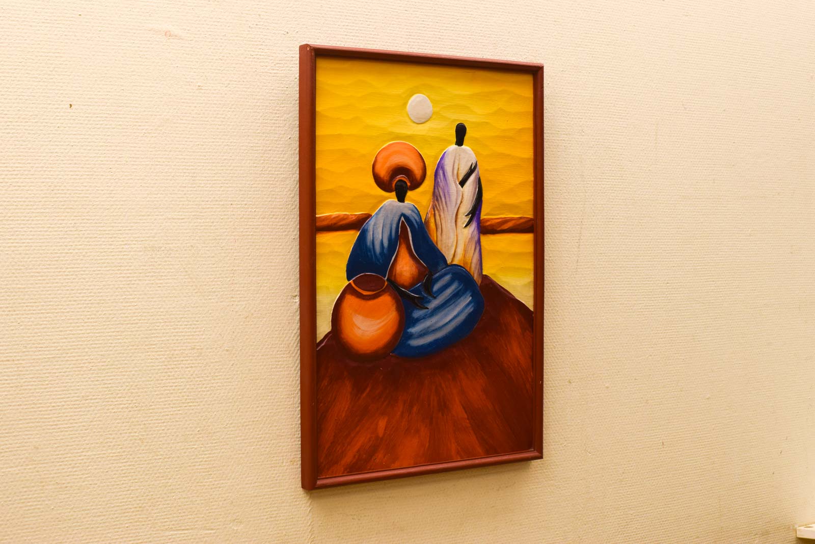 Dit schilderij op hout toont twee figuren in een sfeervolle compositie met warme geel- en oranjettinten. Het werk is rechtstreeks op hout geschilderd en heeft een diepte van 3 centimeter door het houten frame. Het onderwerp lijkt geïnspireerd op figuratieve kunst met een abstract-moderne uitstraling.