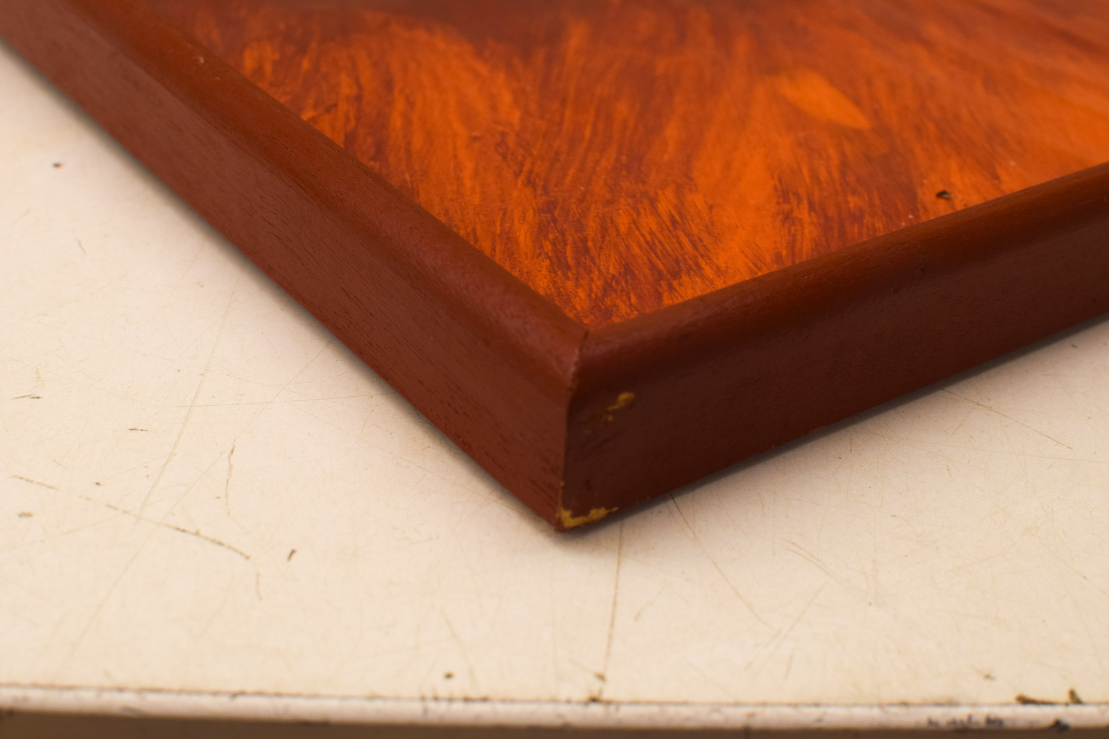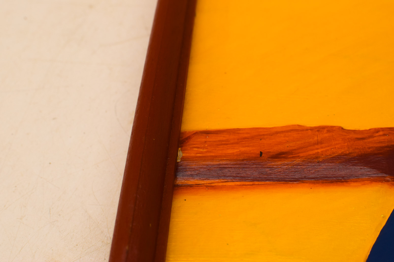Het schilderij op hout vertoont lichte gebruikssporen passend bij de leeftijd en geschiedenis van het werk. De houten lijst toont normale patina en kleinere tekenen van gebruik, wat geen afbreuk doet aan het geheel. De afmetingen van 42 bij 62,5 centimeter maken het een fraai formaat voor aan de muur zonder oversized te zijn.