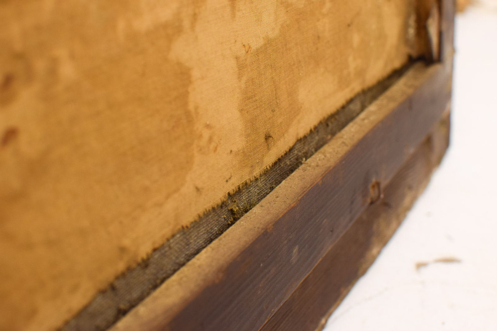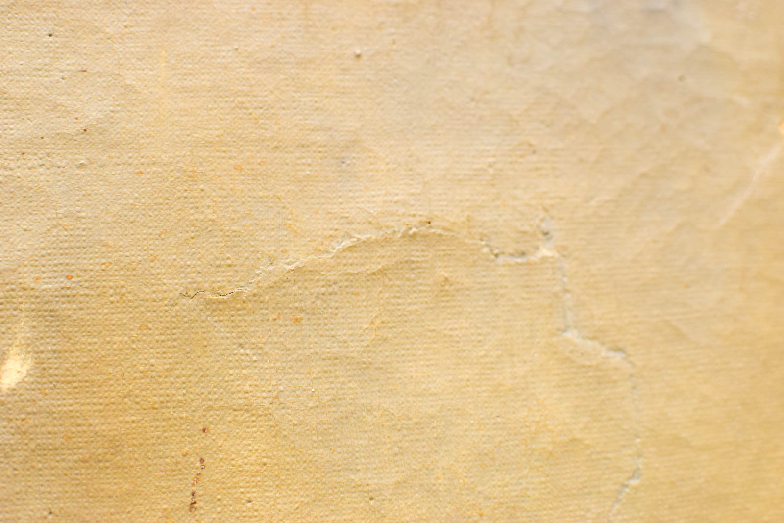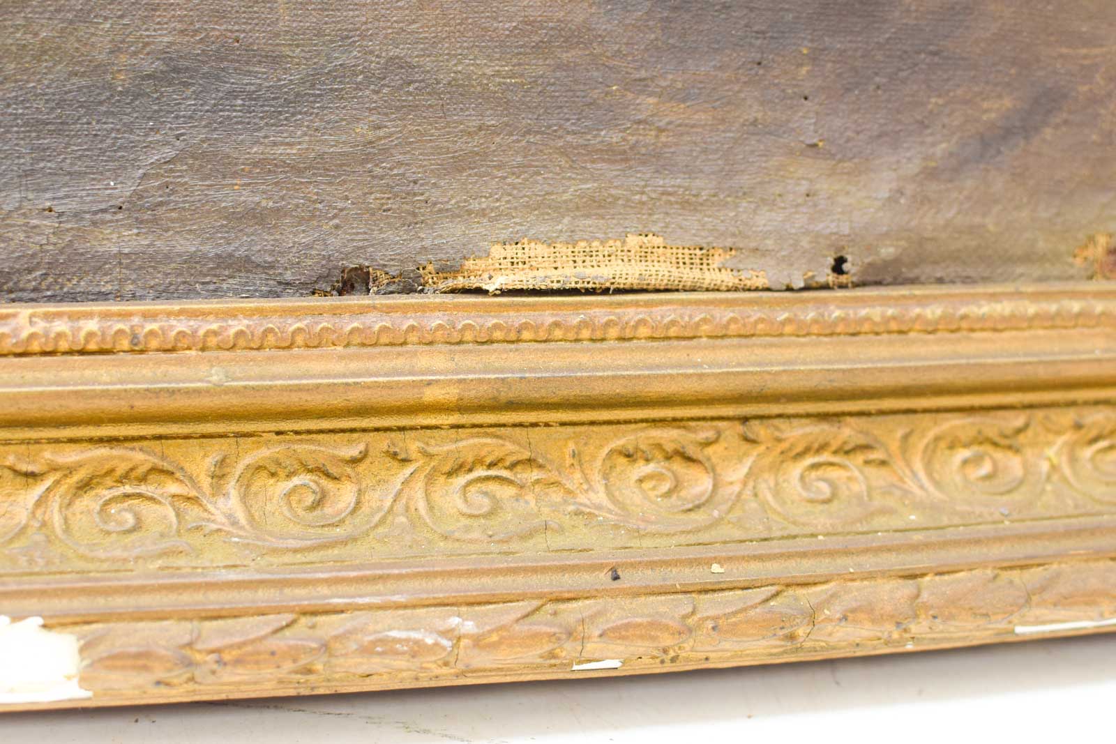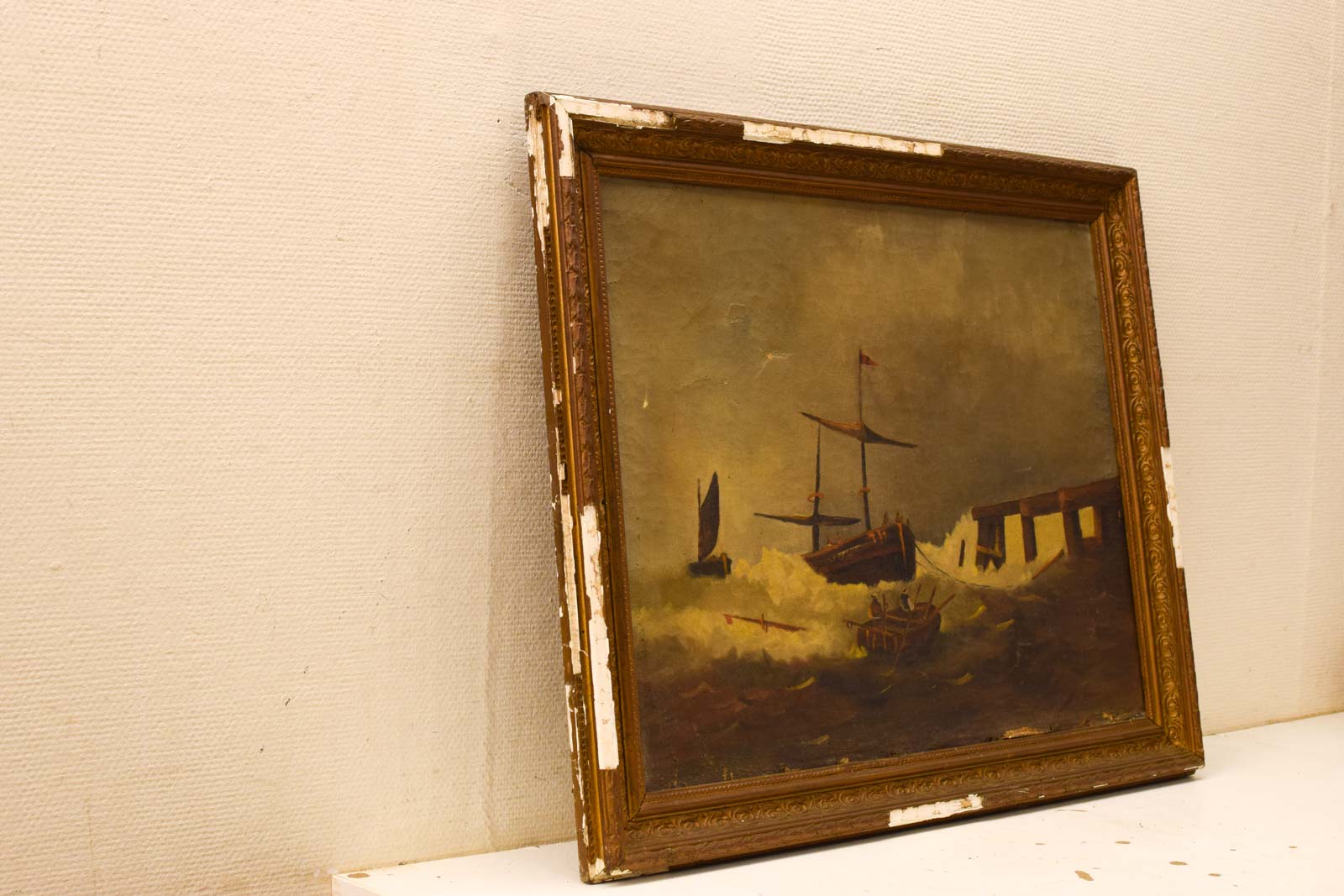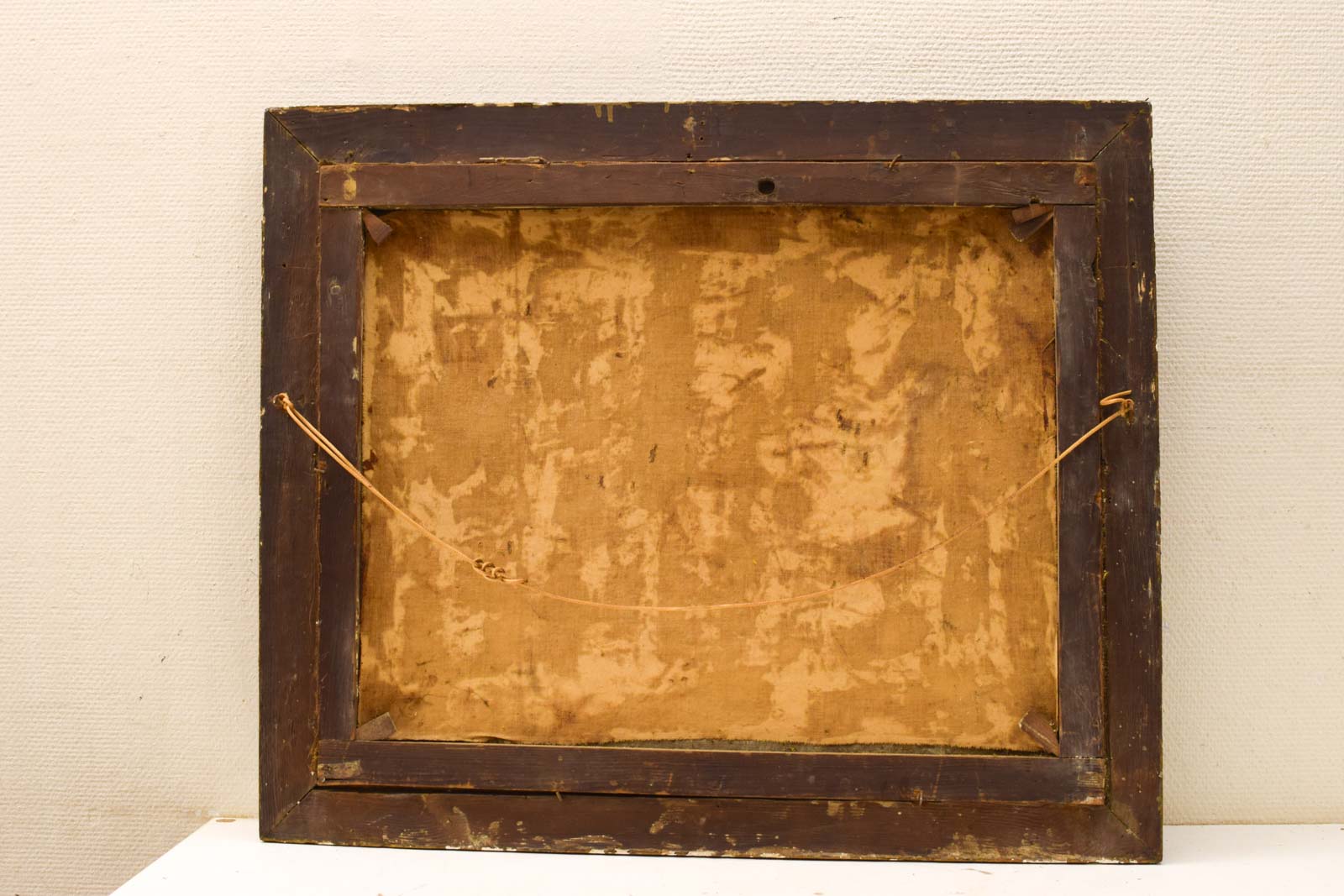 Het schilderij vertoont leeftijdsgetuigen. De lijst brokkelt af op verschillende plaatsen, vooral zichtbaar aan de hoeken en randen. Het doek zelf is verkleurd met een geligele tint door veroudering, en het oppervlak heeft gebruikssporen die wijzen op decennia bewoning. De verf is deels gecraquelé en er zijn kleinere beschadigingen zichtbaar. Dit geeft het werk echter ook authenticiteit en karakter van een echt vintage stuk met geschiedenis.