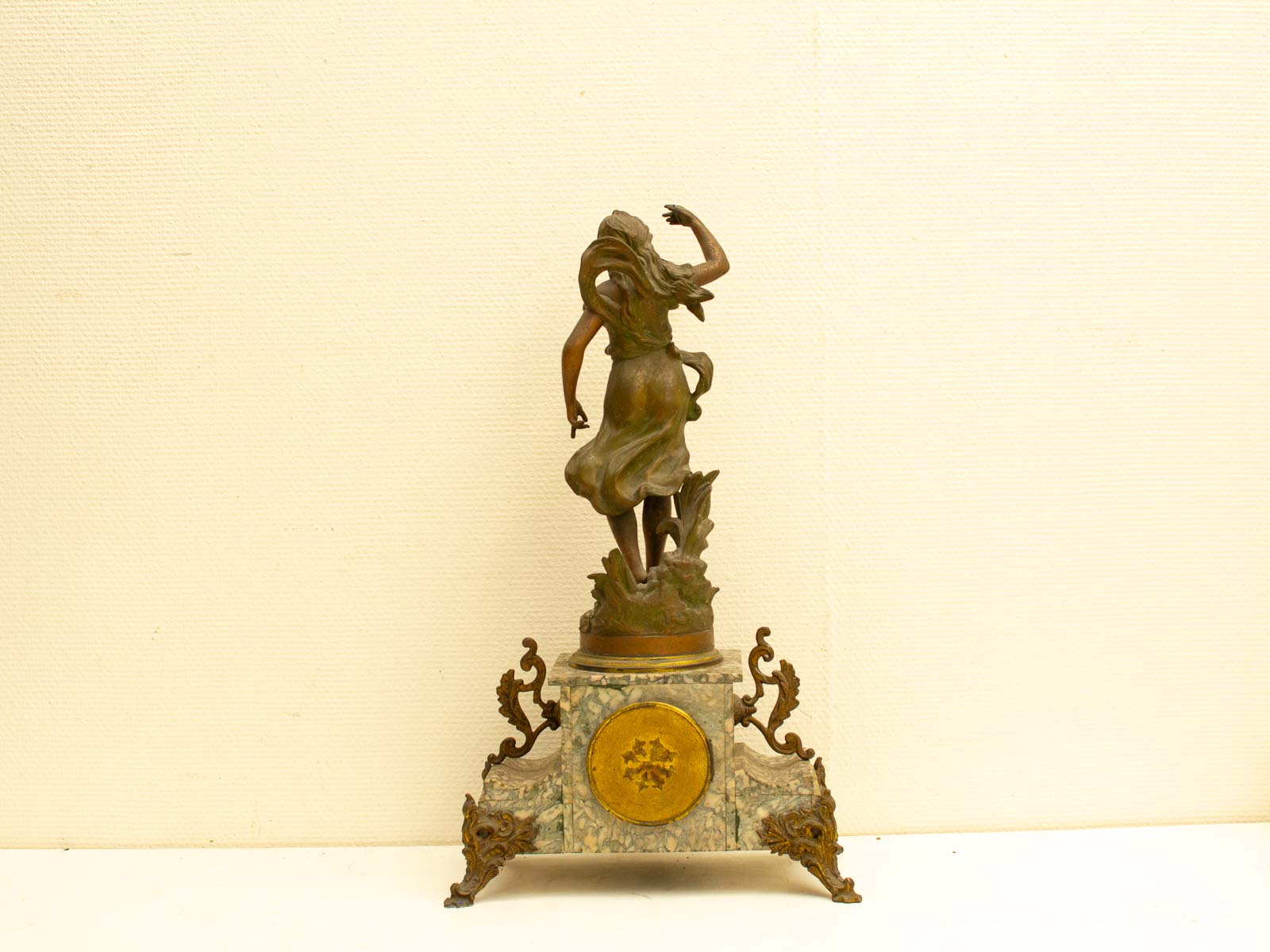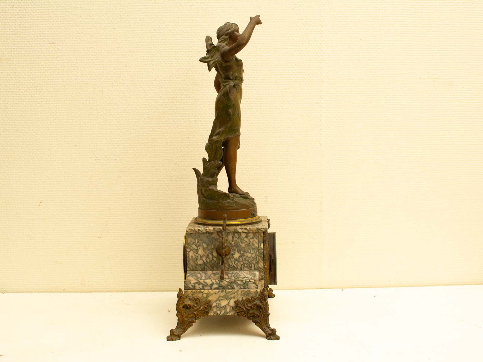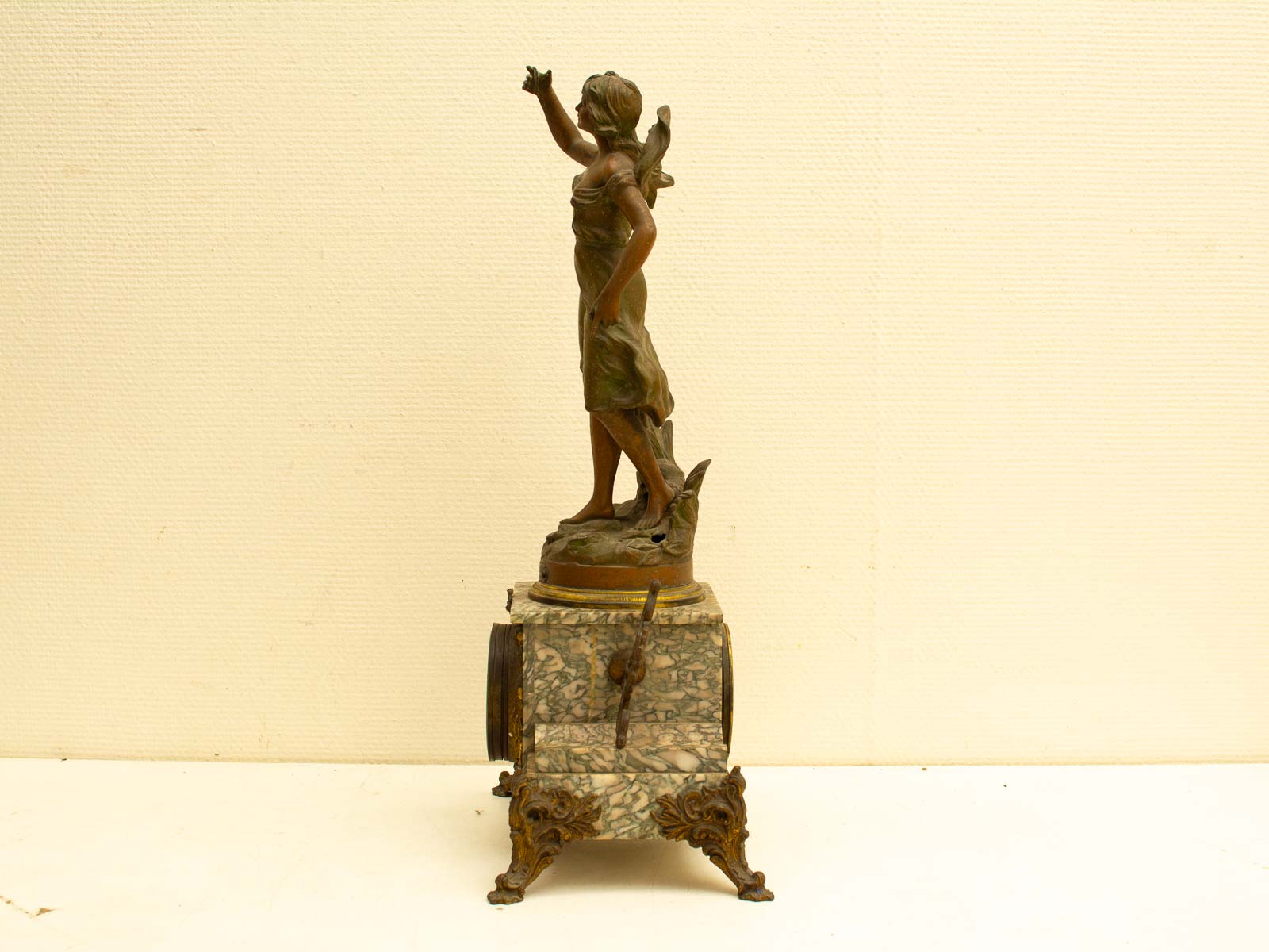 de klok is gemaakt van zink en marmer loop of sloop zit geen sleutel bij zit een gaatje bij het beeld zie foto 1 voetje is los