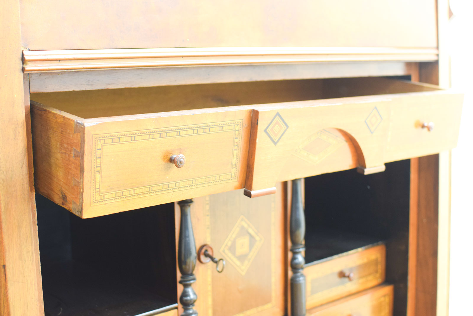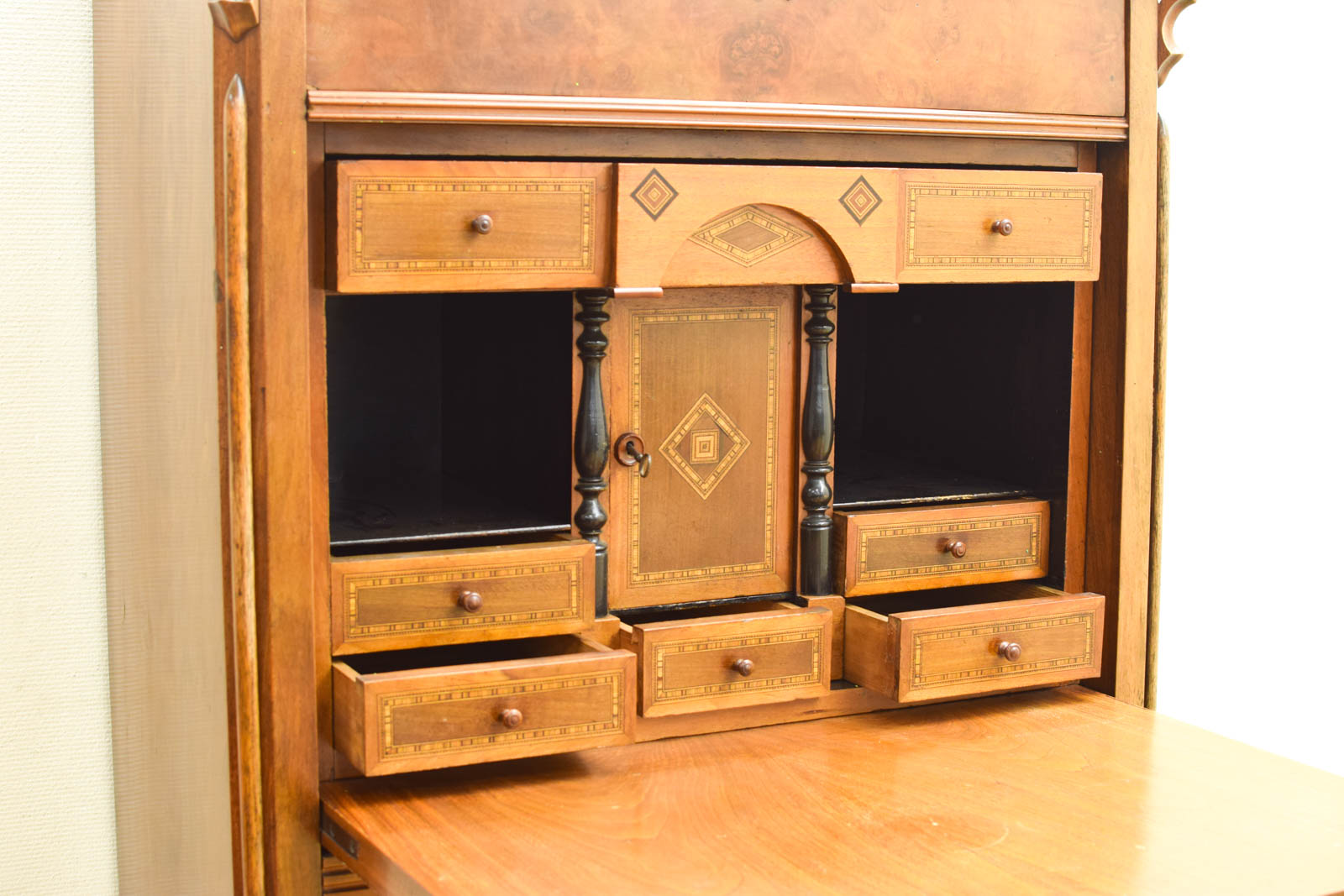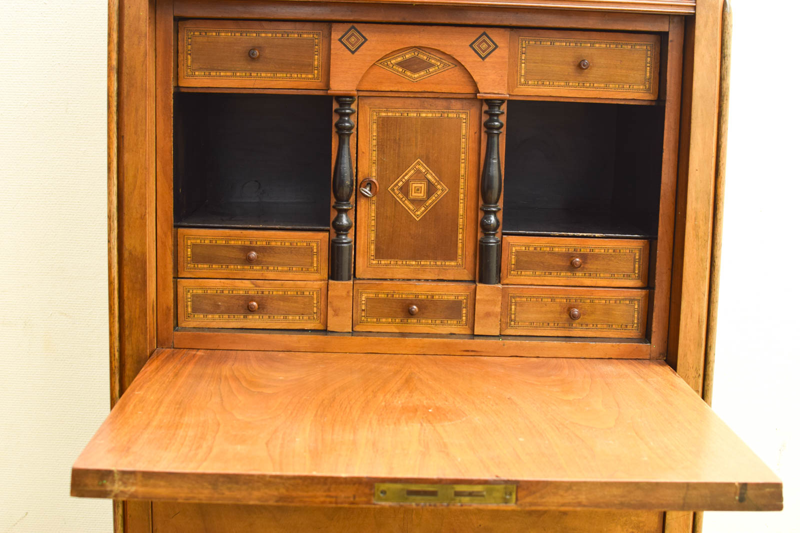 Deze secretaire is een klassieke houten kast voor bureau- en schrijfwerk. Met een hoogte van 183 cm, breedte van 96 cm en diepte van 46,5 cm past de secretaire in een riante kamer. De voorkant heeft een uitklapbare werkblad, daaronder zit een gedetailleerd opgewerkt onderkastje met kleine laden en kasten met ingelegd vurenhout en decoratieve ruit-motieven.