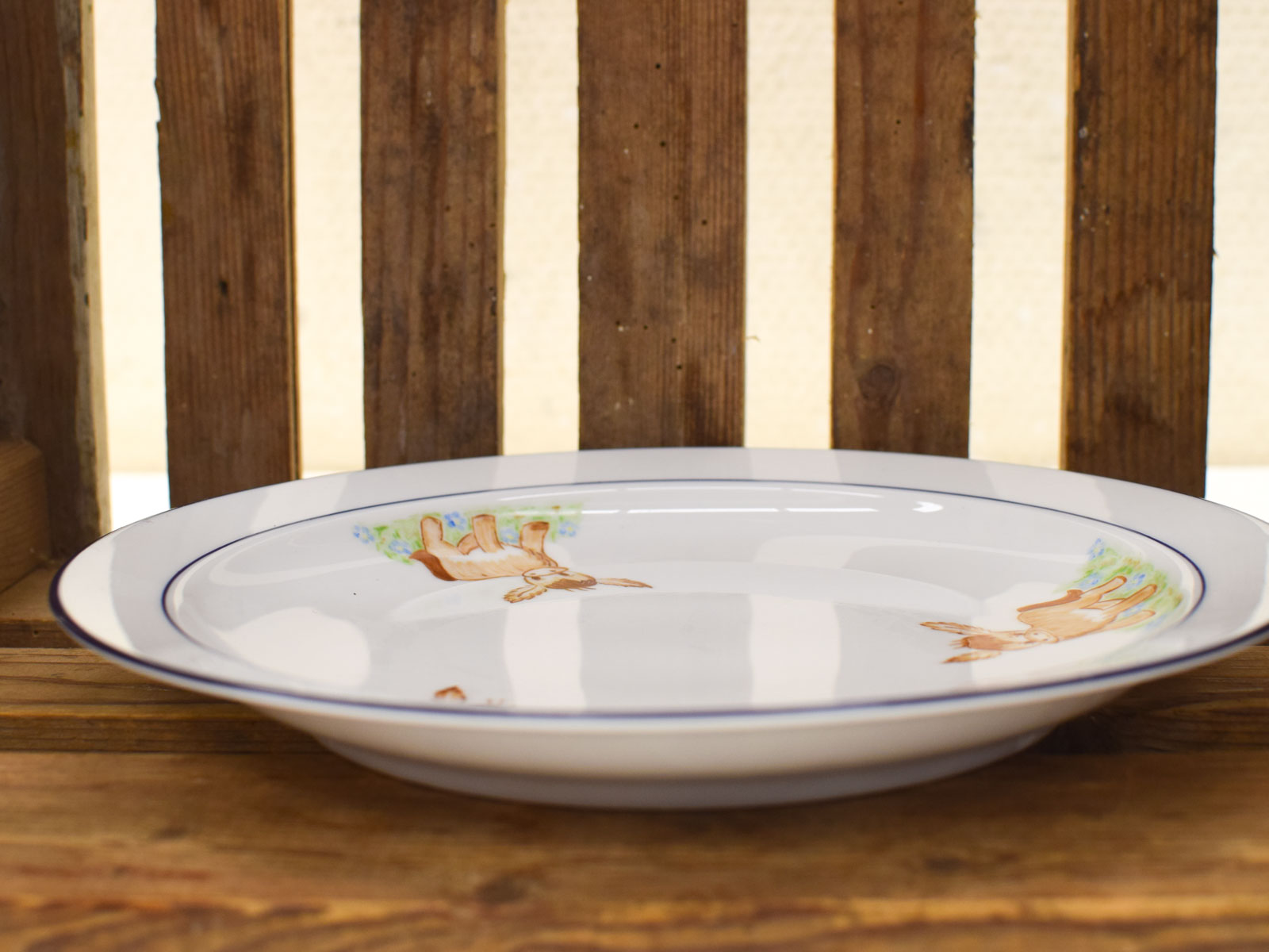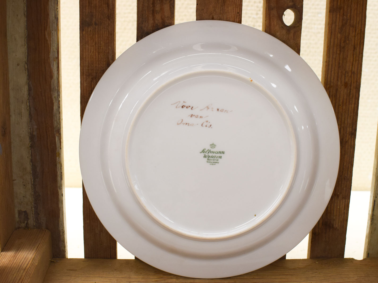 De borden hebben een prent van een ezel de borden hebben krasjes door het gebruik maar zijn nog heel platte bord gemeten diameter 23,5 cm hoog 3 cm diepe bord gemeten