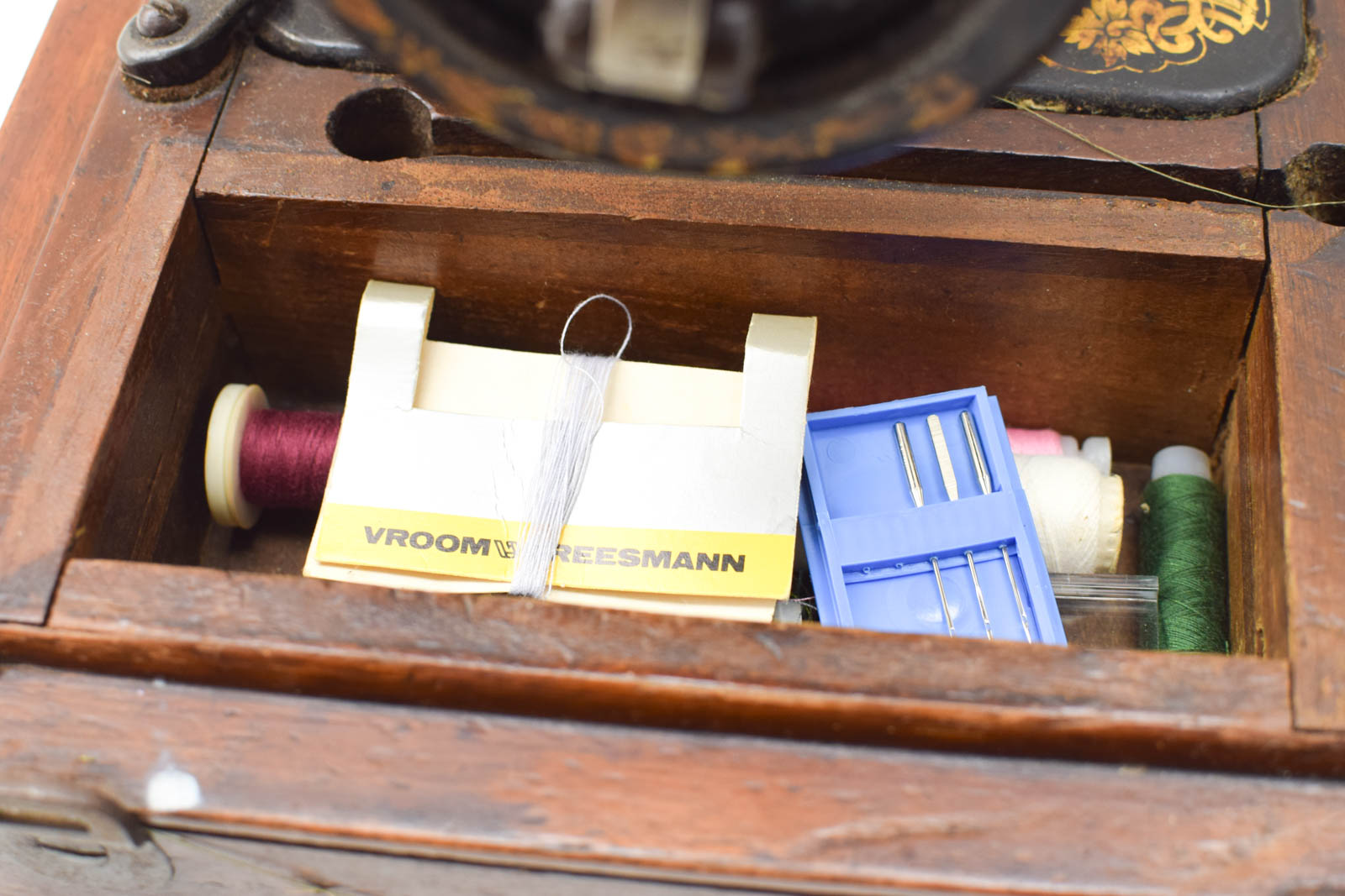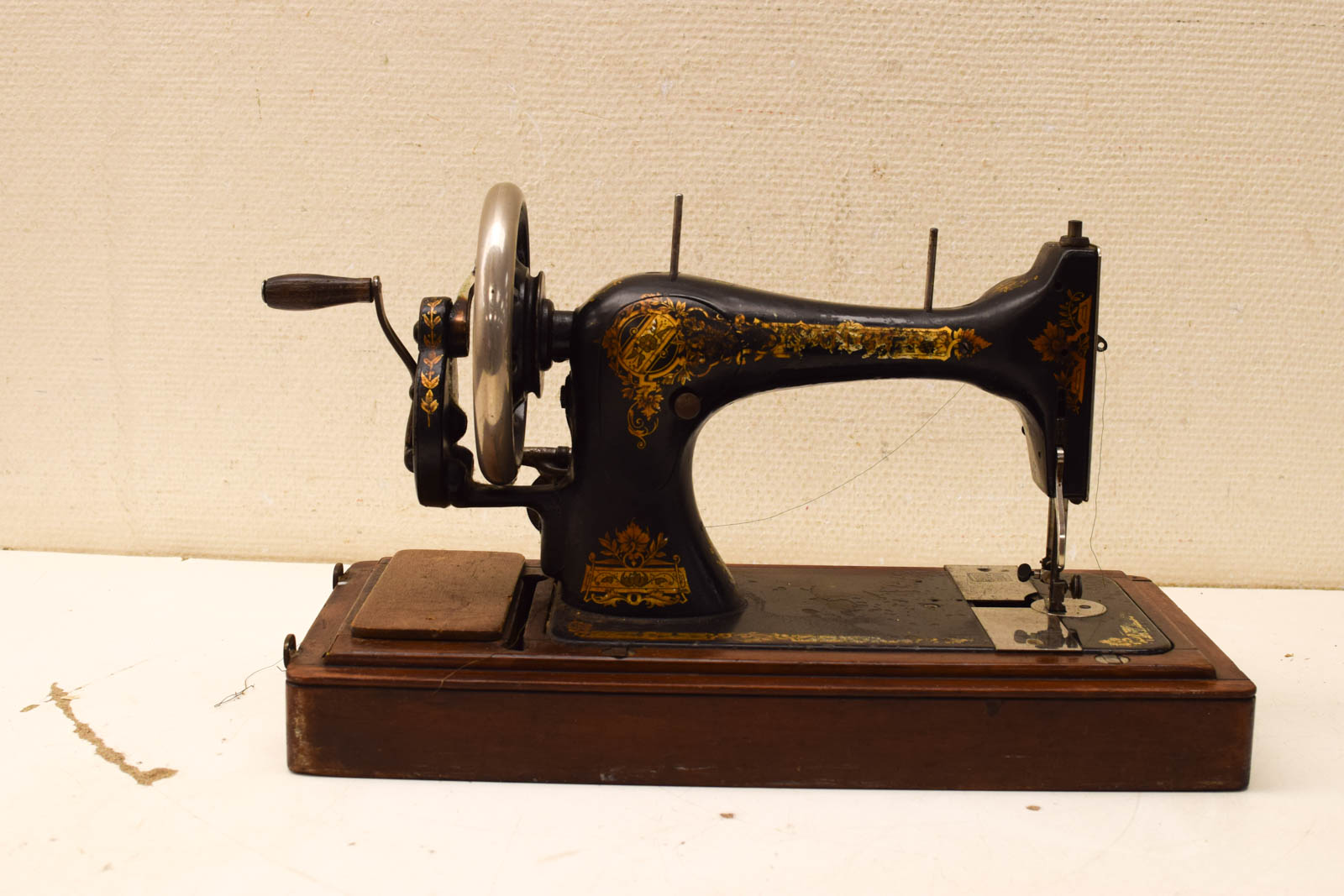 de naaimachine doet het is gebruikt en heeft gebruikssporen zit in een bruine koffer is geen sleutel bij de koffer gemeten breed 45 cm diepte 23,5 cm hoog 30 cm