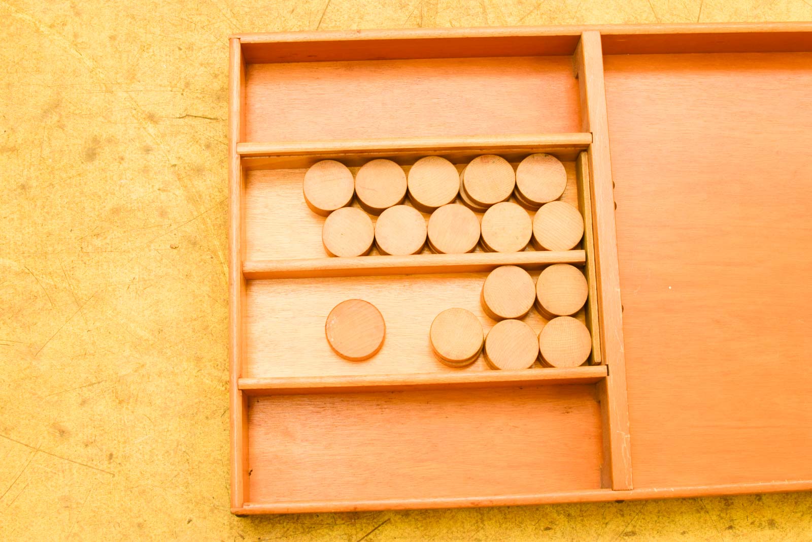 heeft 30 houten schijven diameter 4 cm en 1 grotere van diameter 5 cm de sjoelbak heeft gebruikssporen lang 183 cm