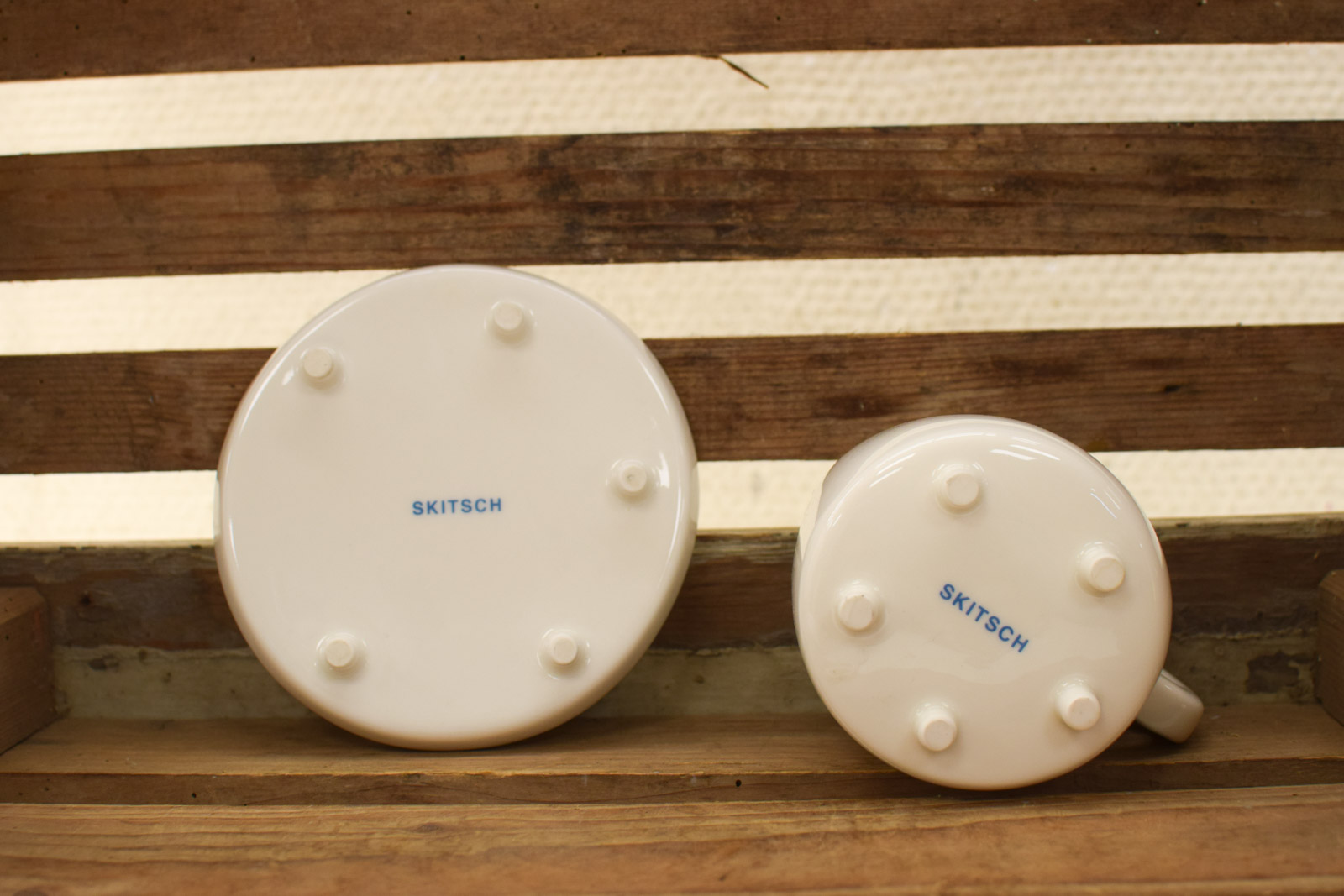 diameter bovenkant van het kopje 7,5 cm hoog 10 cm diameter van het schaaltje 12,5 cm hoog 2 cm het servies heeft aan de onderkant pootjes zie foto