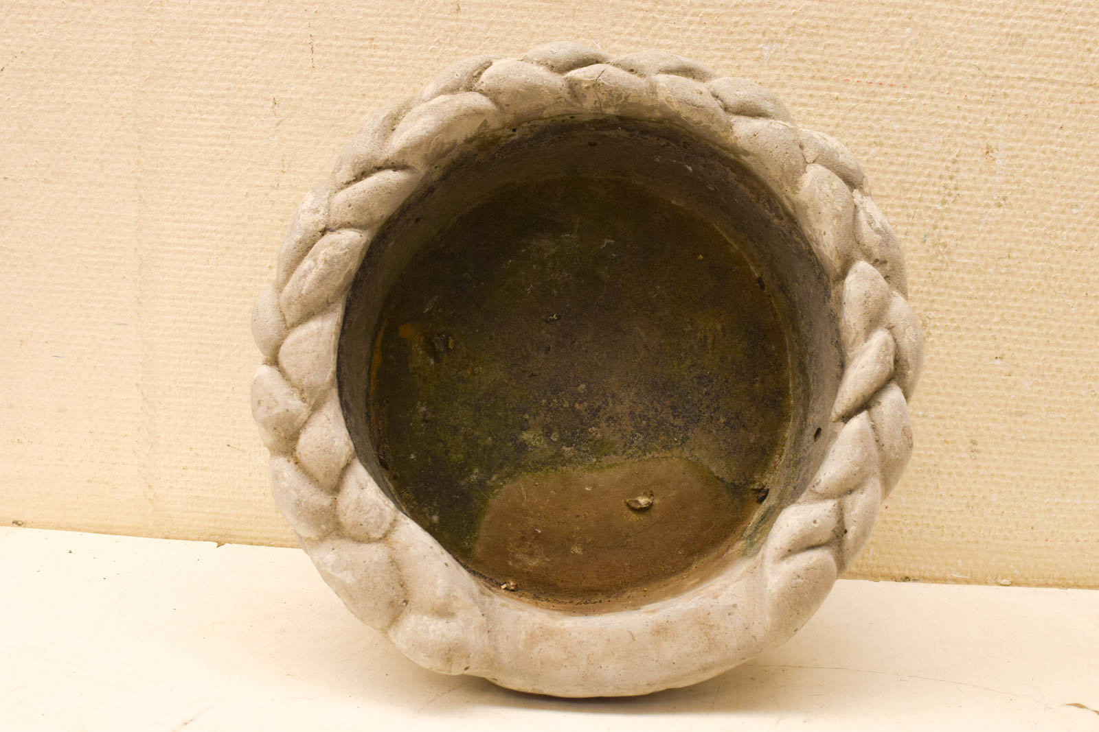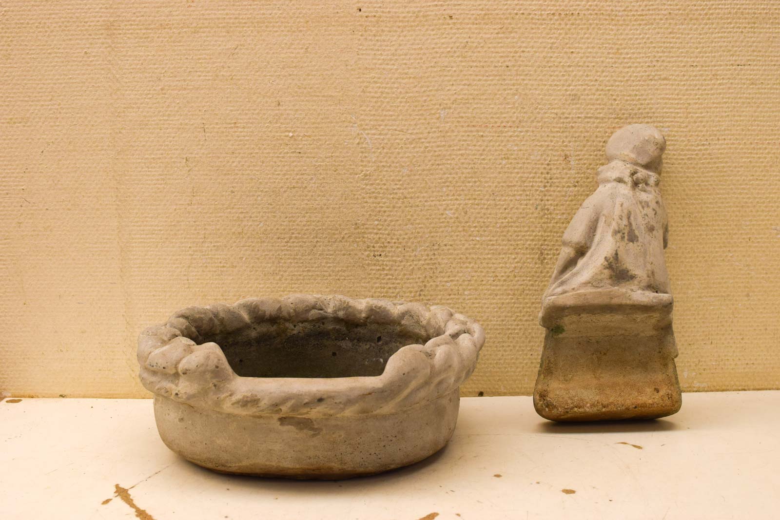 Het tuinbeeld is gemaakt van steen en laat duidelijk sporen van buitenliggen zien. Er is groene aanslag op het materiaal, wat typerend is voor tuinbeelden die jaren in de tuin hebben gestaan. De afwerking is nog redelijk goed ondanks de ouderdom. De mand zelf heeft een nette vorm met mooie details langs de rand.
