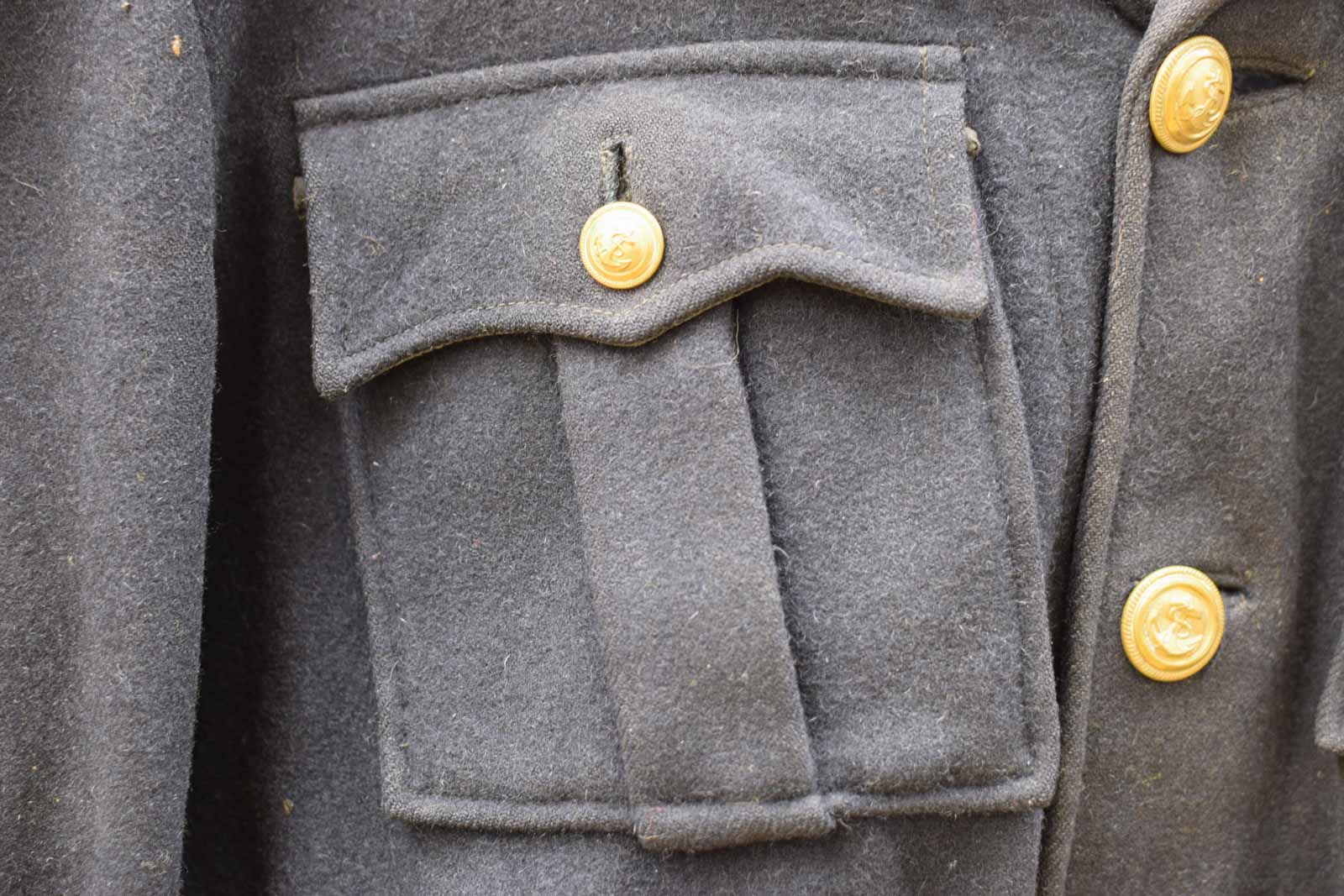 is van stof kleur donkerblauw gemeten met kraag tot einde lang 67 cm de mouw lang 66 cm gemeten van oksel tot oksel 52 er staat geen maat in de jas is gebruikt