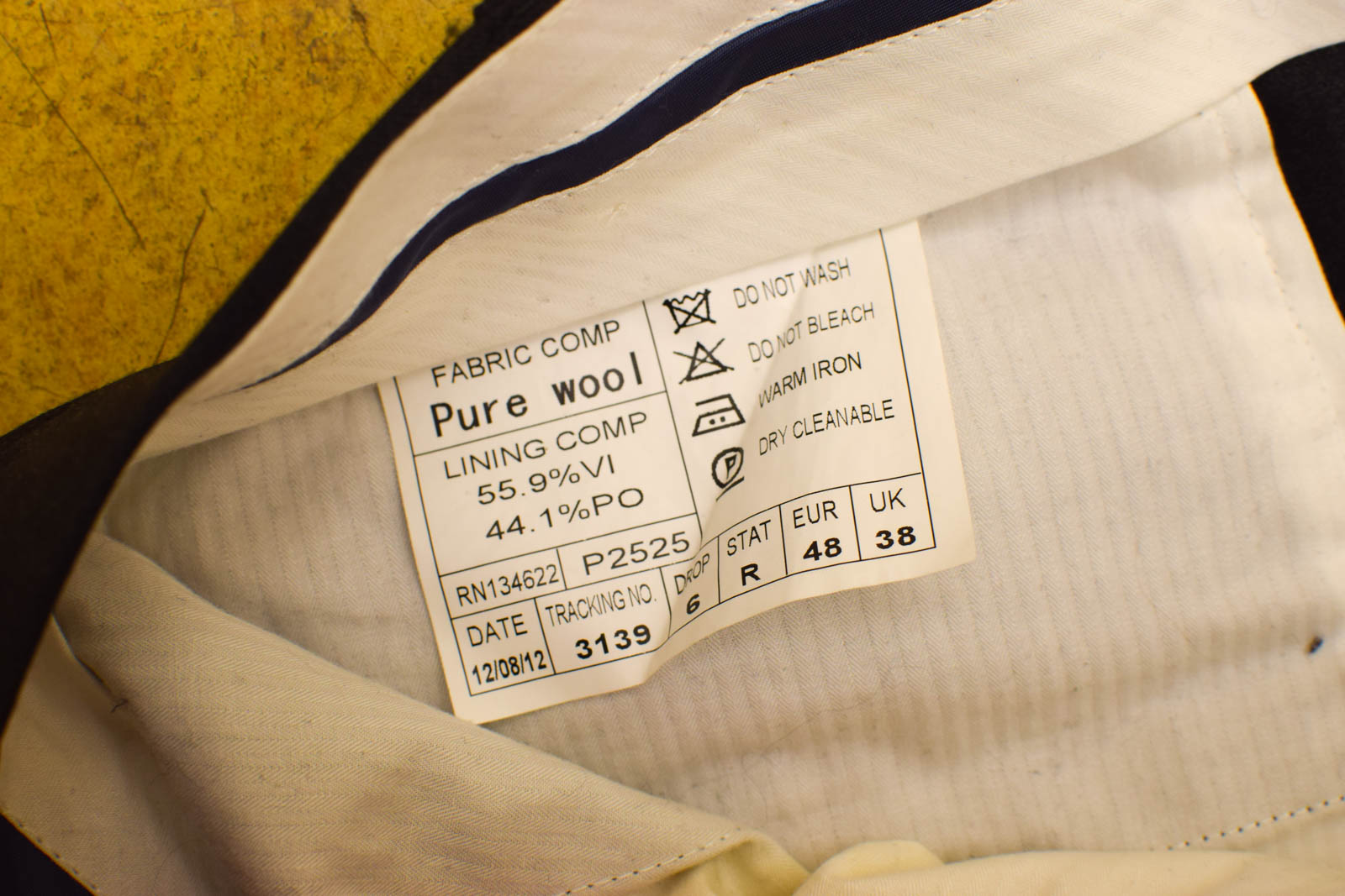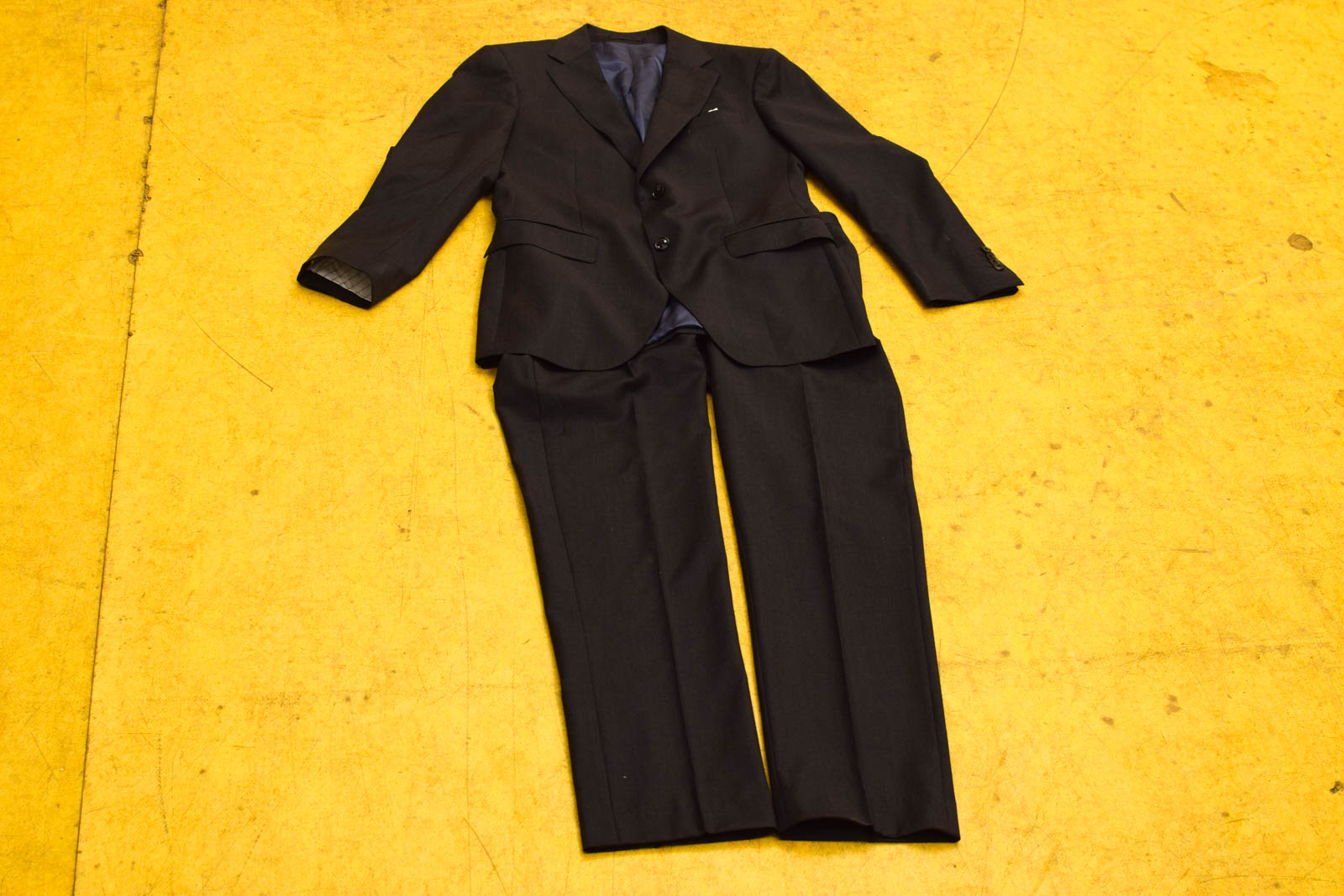bij de broek bovenrand is een beschadiging zie foto verder ziet de pak er nog goed uit is in de maat 48