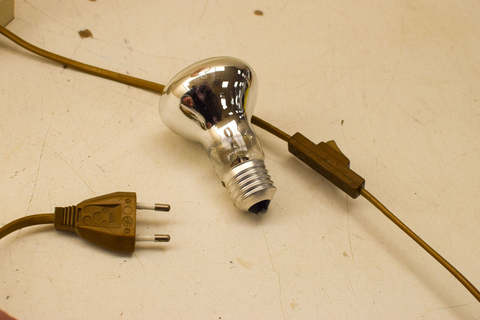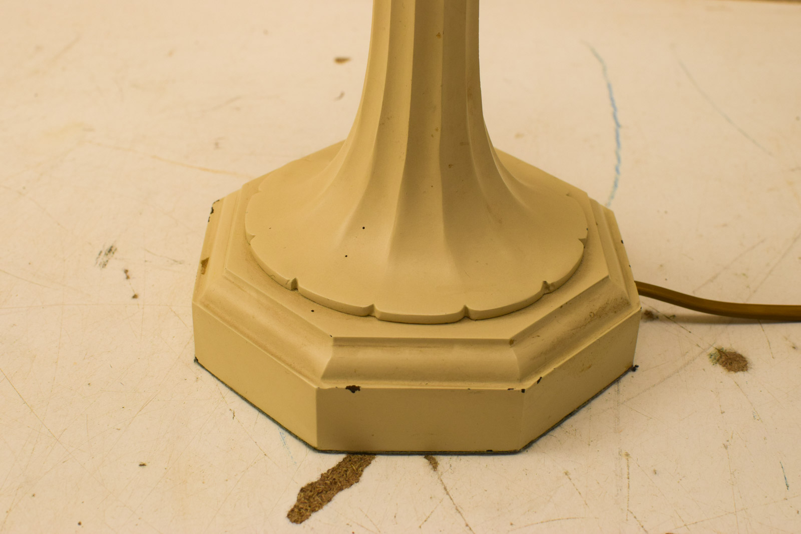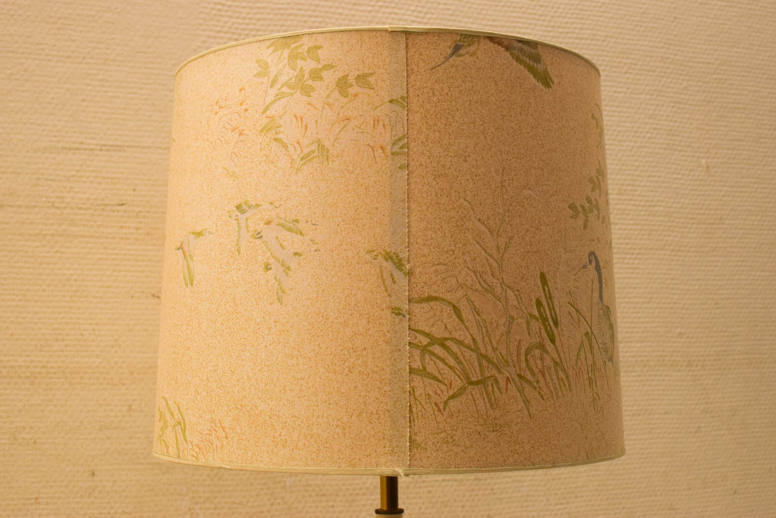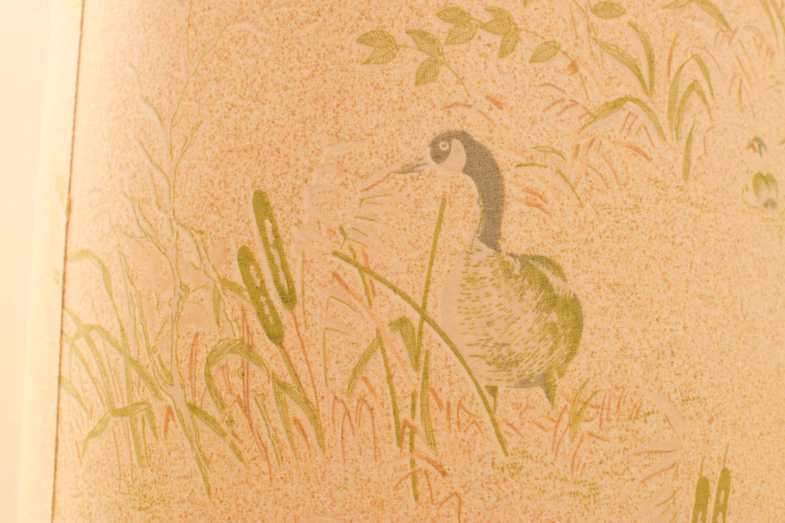 de kap heeft een prentje van een vogel de kap is verkleurd de onderstel heeft gebruikssporen