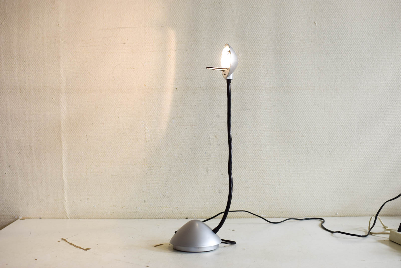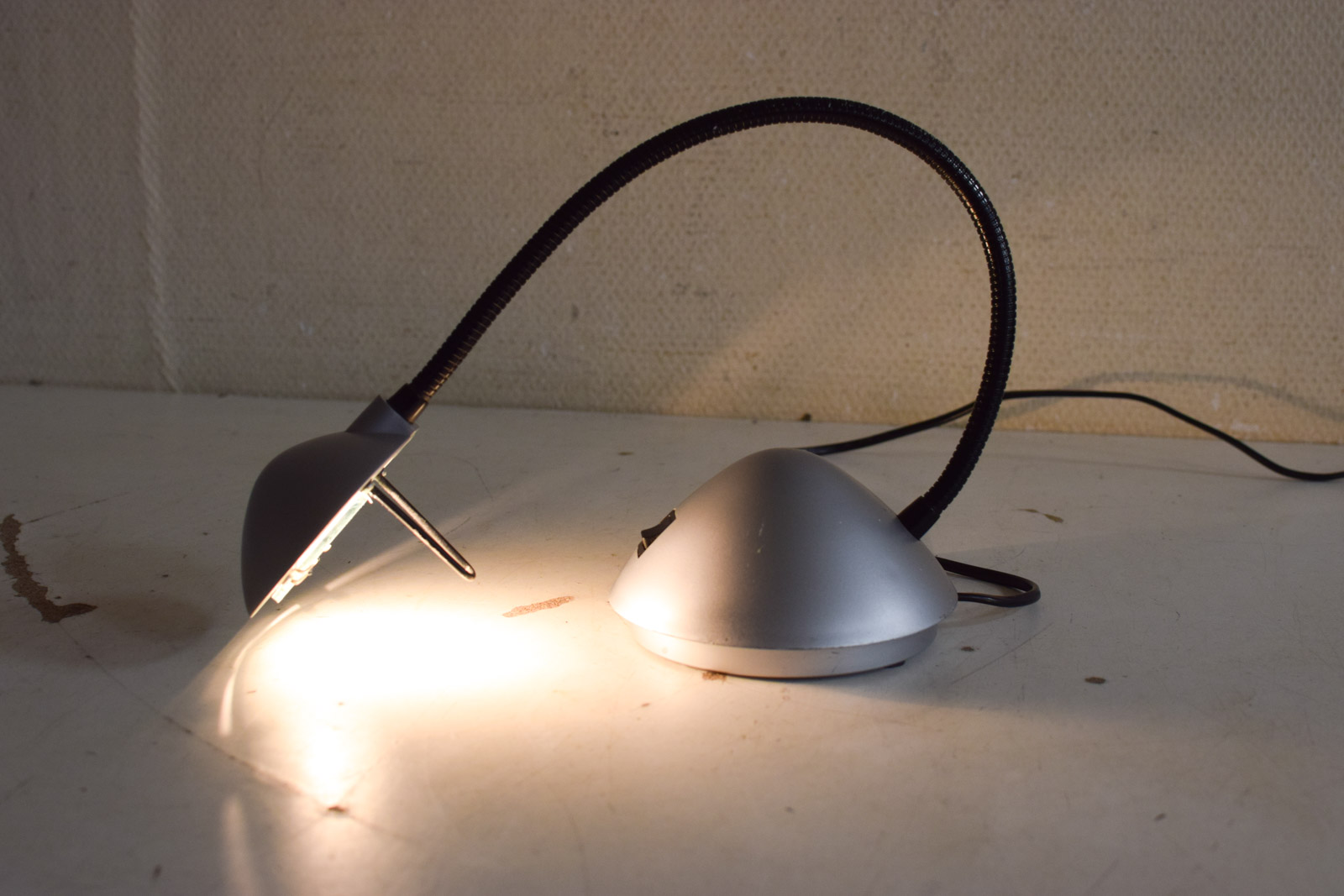 heeft een buigzame arm hoogste gemeten 55 cm de laagste punt gemeten bij de boog 20 cm de lamp heeft gebruikssporen zoals krassen