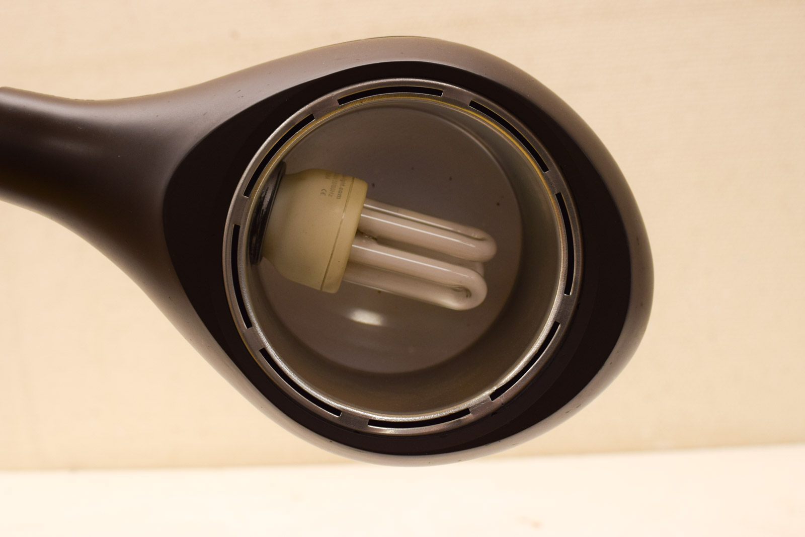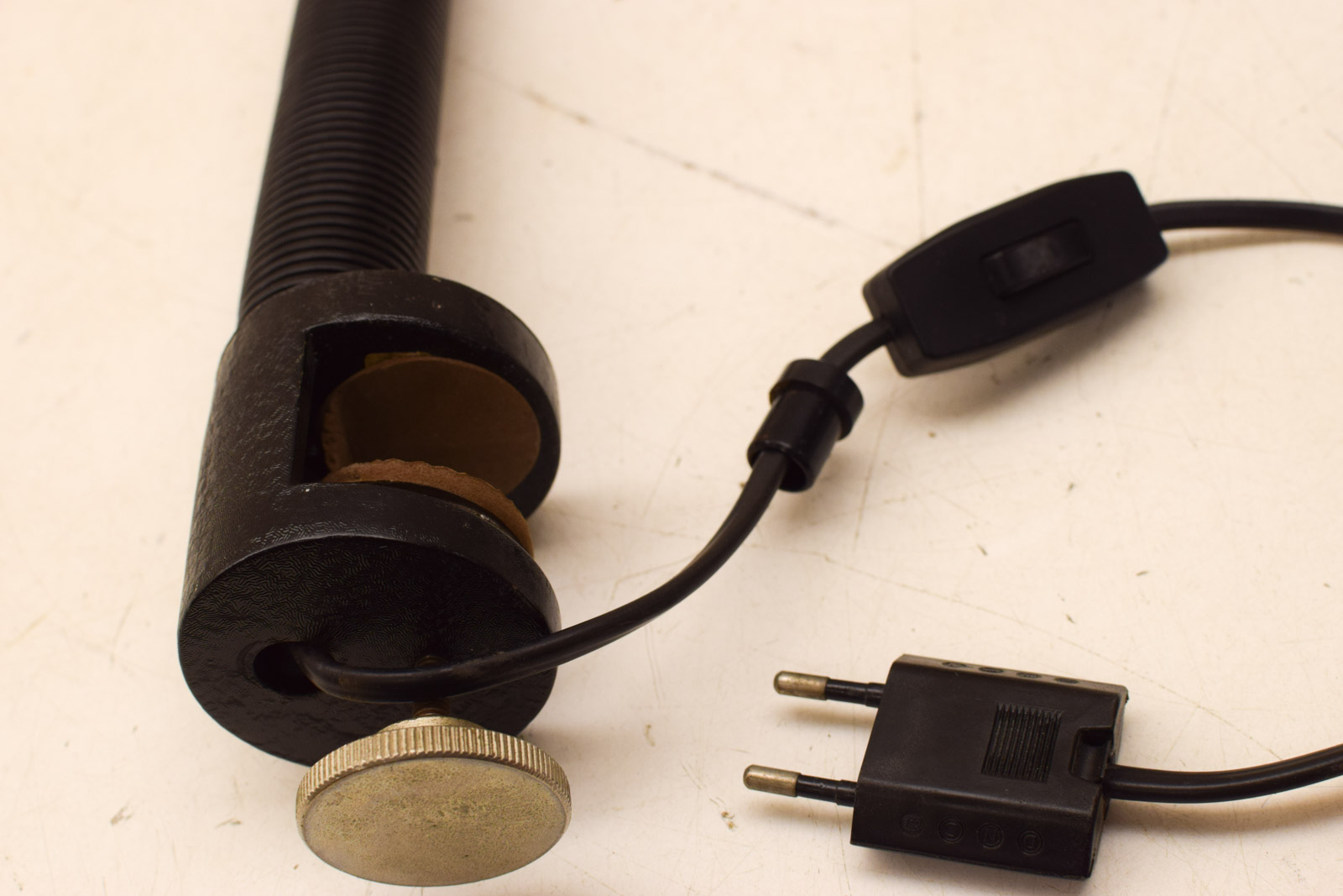 de arm is buigzaam de lamp is van plastic de tafelklem van metaal helemaal gemeten hoog ongeveer 85 cm gemeten bij de boog hoog 38 cm