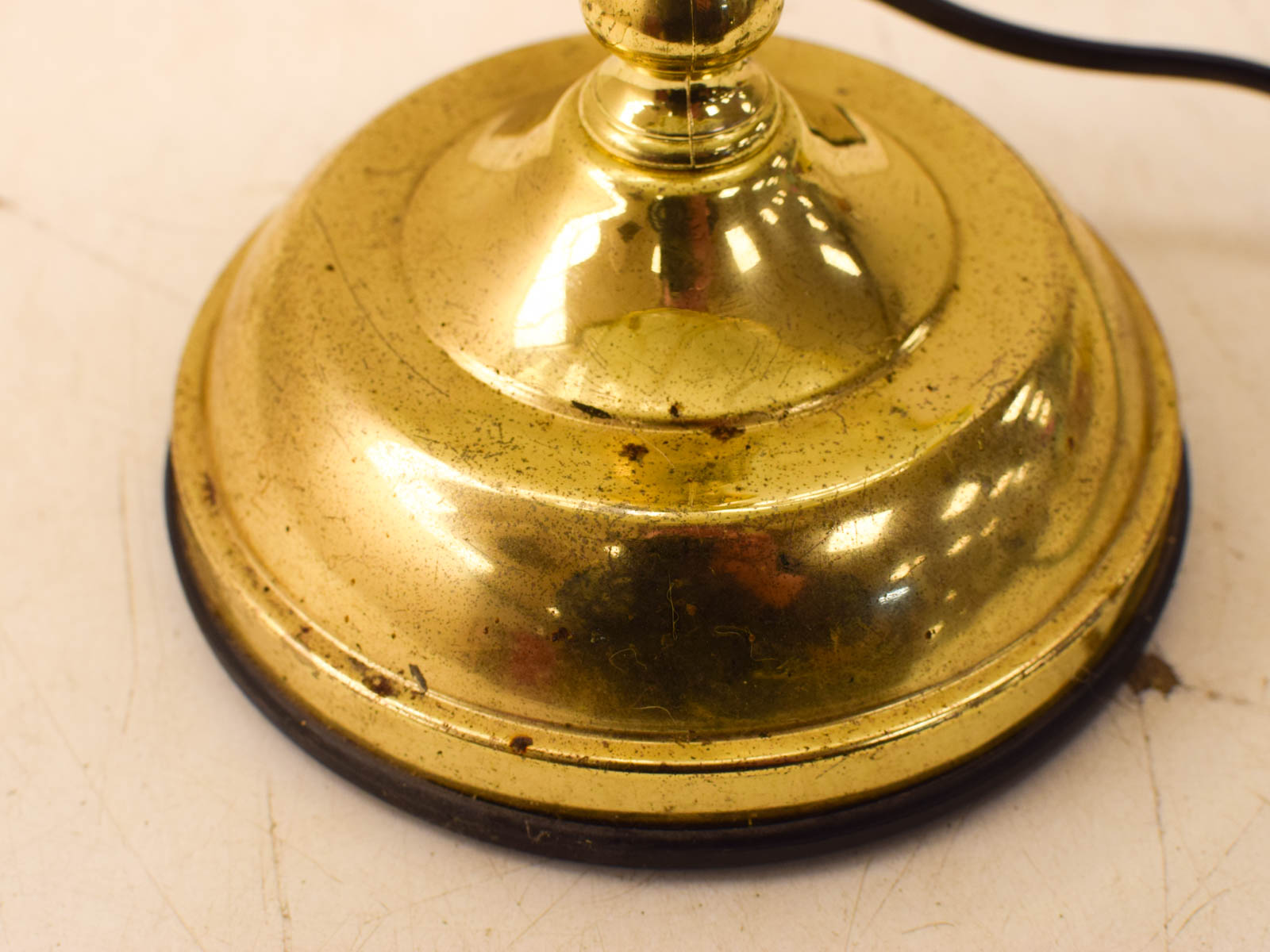 De messing tafellamp voelt solide en heeft karakter. Het glas is helder met subtiel ingegroeide patronen die licht doorlatend zijn. De goudgele kleurtoon geeft een warme, gedempte lichtval. De voet toont duidelijk gebruikssporen, zichtbare oxidatie en verkleuring van het messing. Dit geeft de lamp die authentieke vintage look.