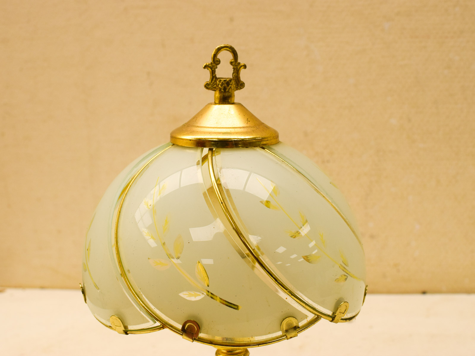 Deze messing tafellamp met glas is een klassieke verschijning uit de jaren 70. De lamp heeft een stevige messing voet met decoratieve details en daarbovenop een geel getinte glaskap met goud-geel blad- en takjesmotief. De kap wordt vastgehouden door messing banden die om het glas lopen.