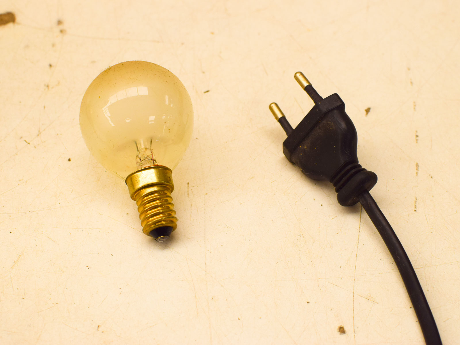 De lamp werkt en is aangesloten met zwarte stofkabel en Europese stekker. Lamptype is E14 met kleine fitting. Staat bruikbaar maar niet nieuwwaardig. Voor wie van retro design houdt en gebruikssporen niet erg vindt.