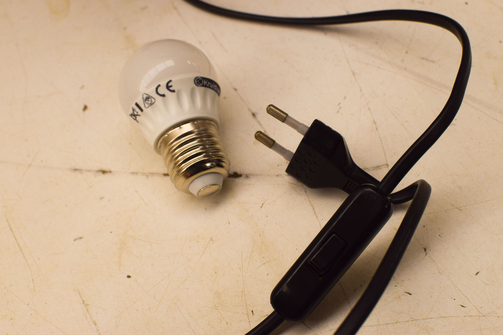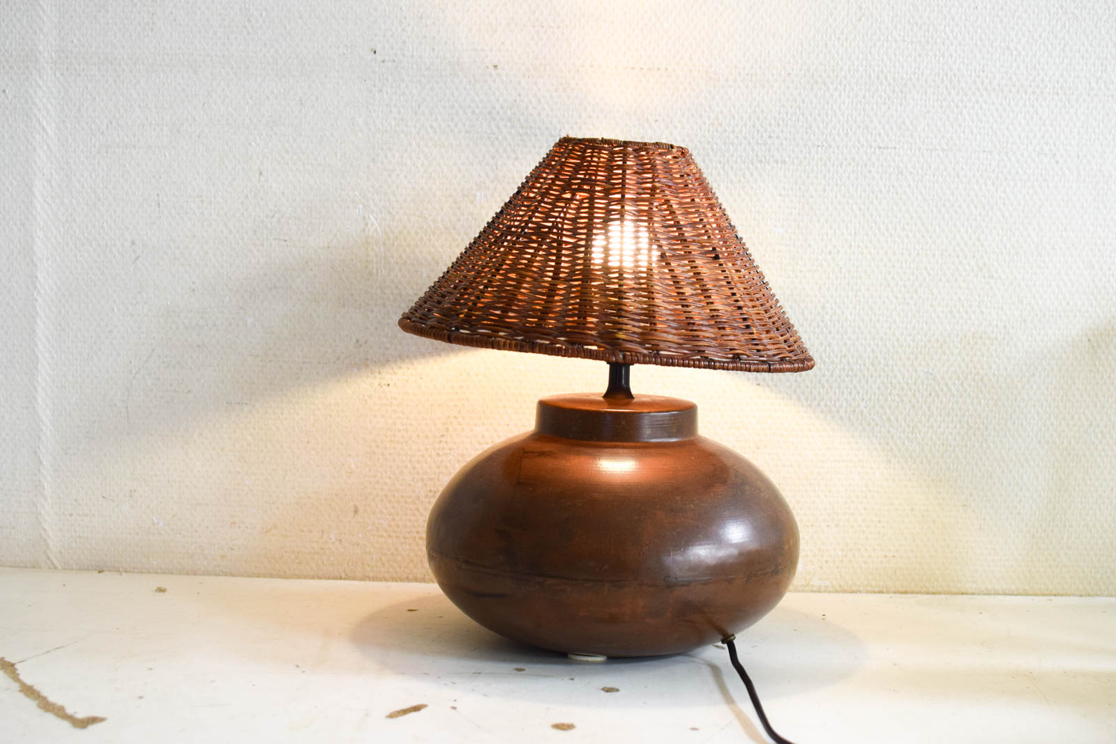 De rotan lampenkap is wat scheef, maar ziet er verder nog redelijk uit. Dit geeft het stuk juist karakter en hoort bij tweedehandsgebruik. De houten voet toont normale gebruikssporen maar is stevig. Met afmetingen van 30 bij 30 centimeter in doorsnee en 37 centimeter hoog past deze lamp goed op een dressoir, sidetable of nachtkastje.