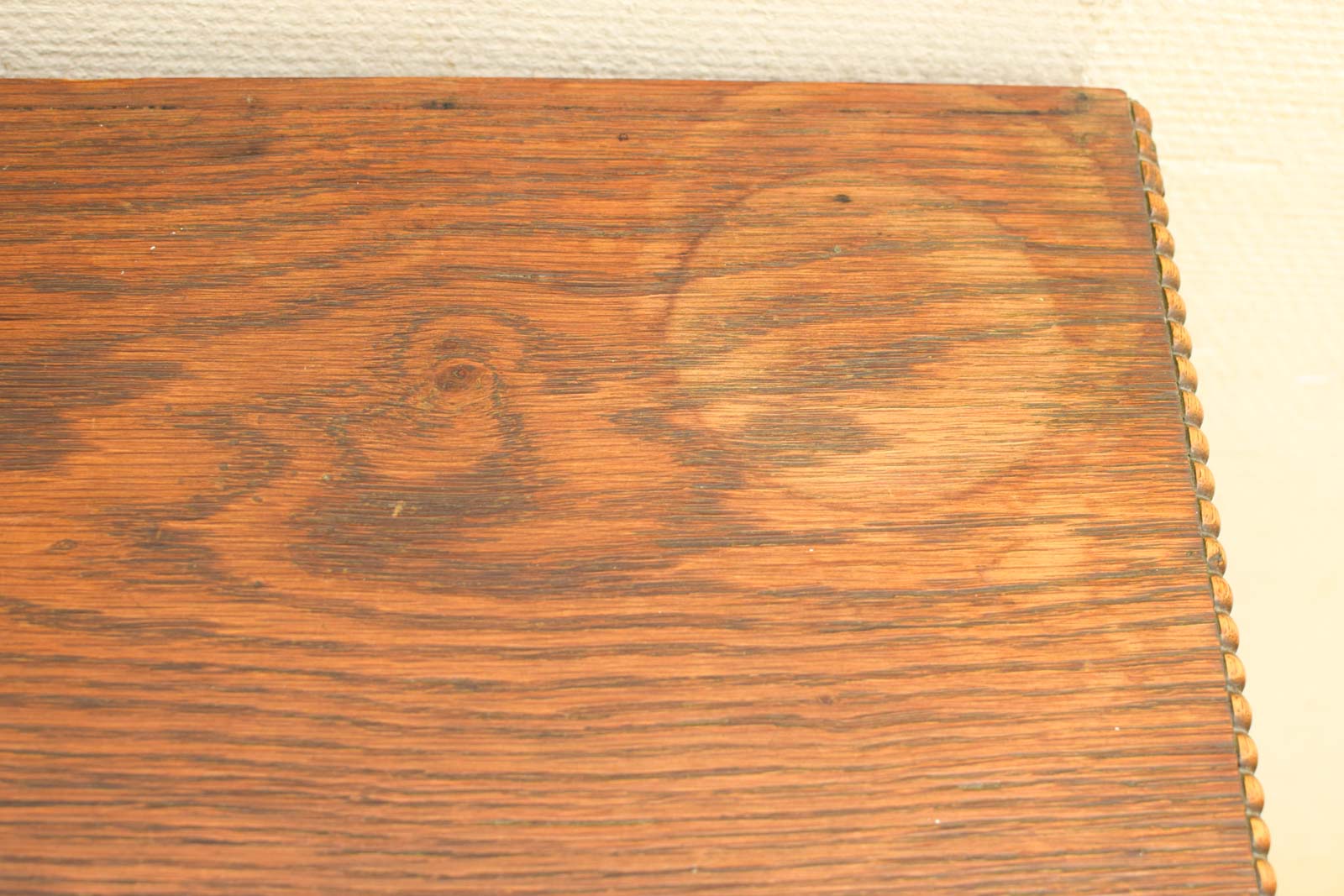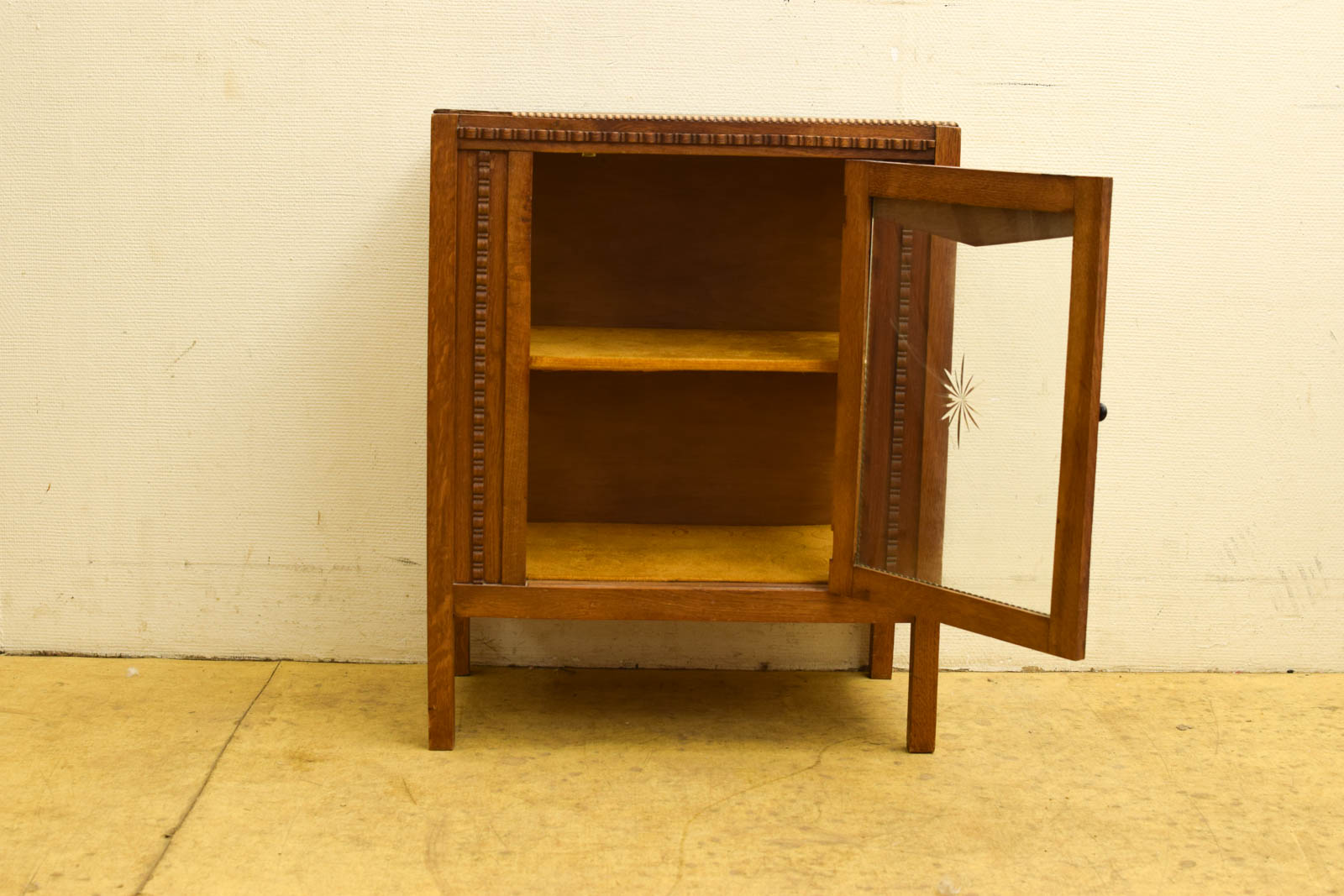 het glas is nog heel bovenblad van de kast heeft een beschadiging vlekken en kringen en verkleuring het kastje is verder nog heel en stevig breed 59,5 cm