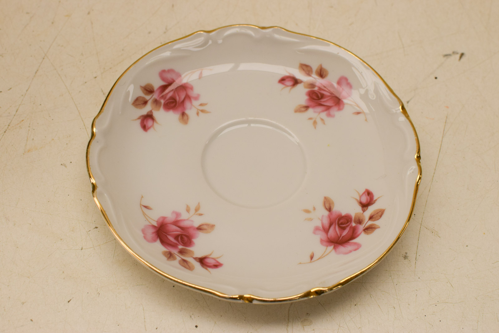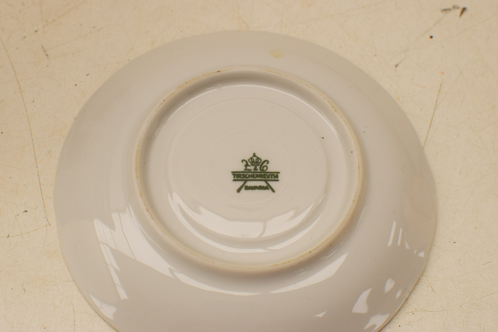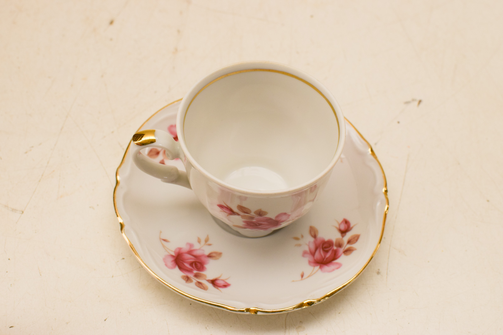 diameter bovenkant van het kopje 7 cm hoog 6,5 cm diameter van het schoteltje 13,5 cm het servies heeft krasjes heeft een goudkleurige rand