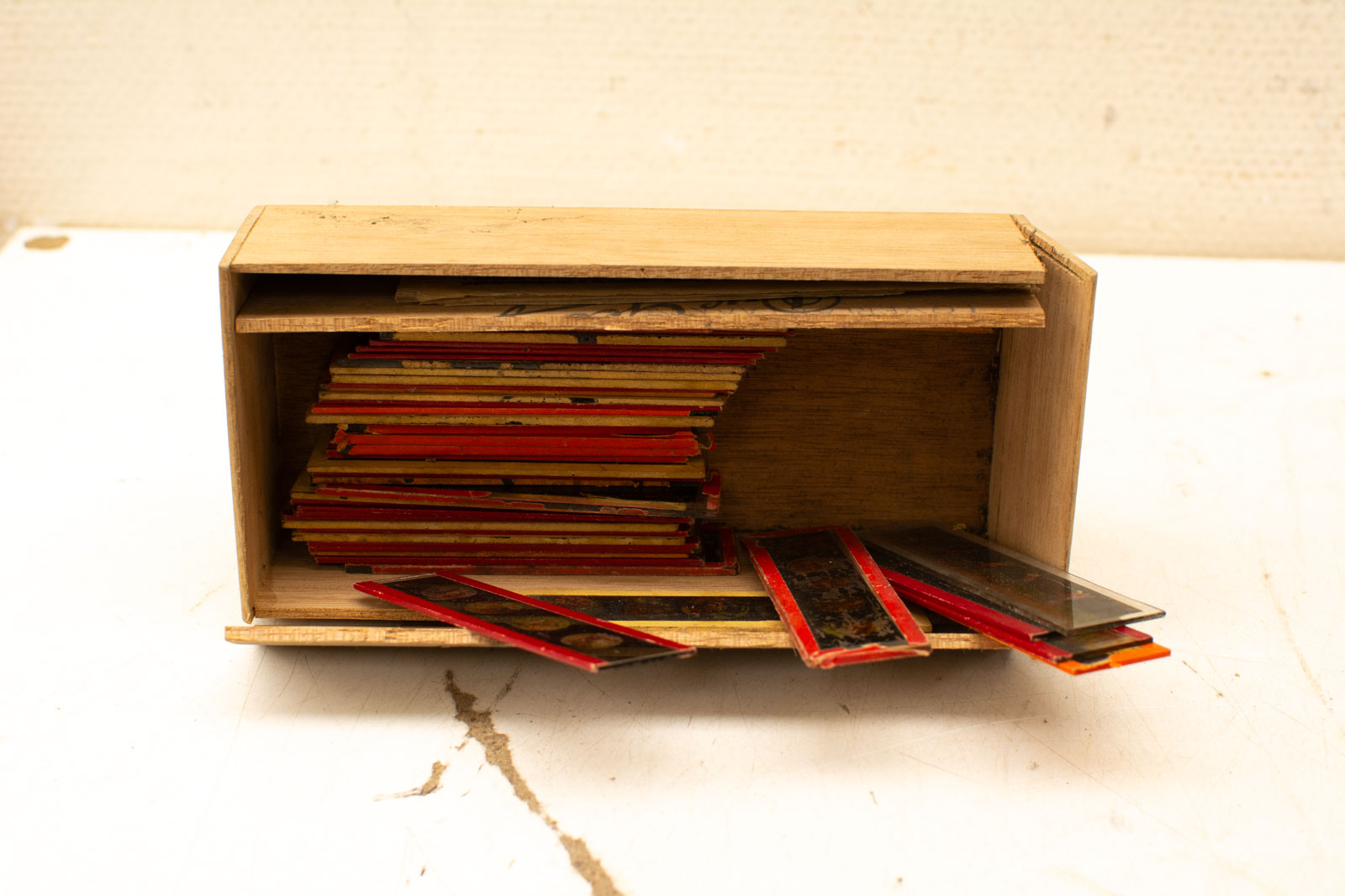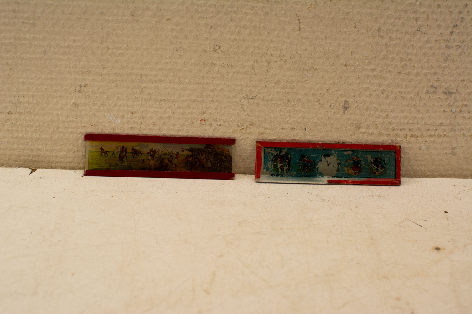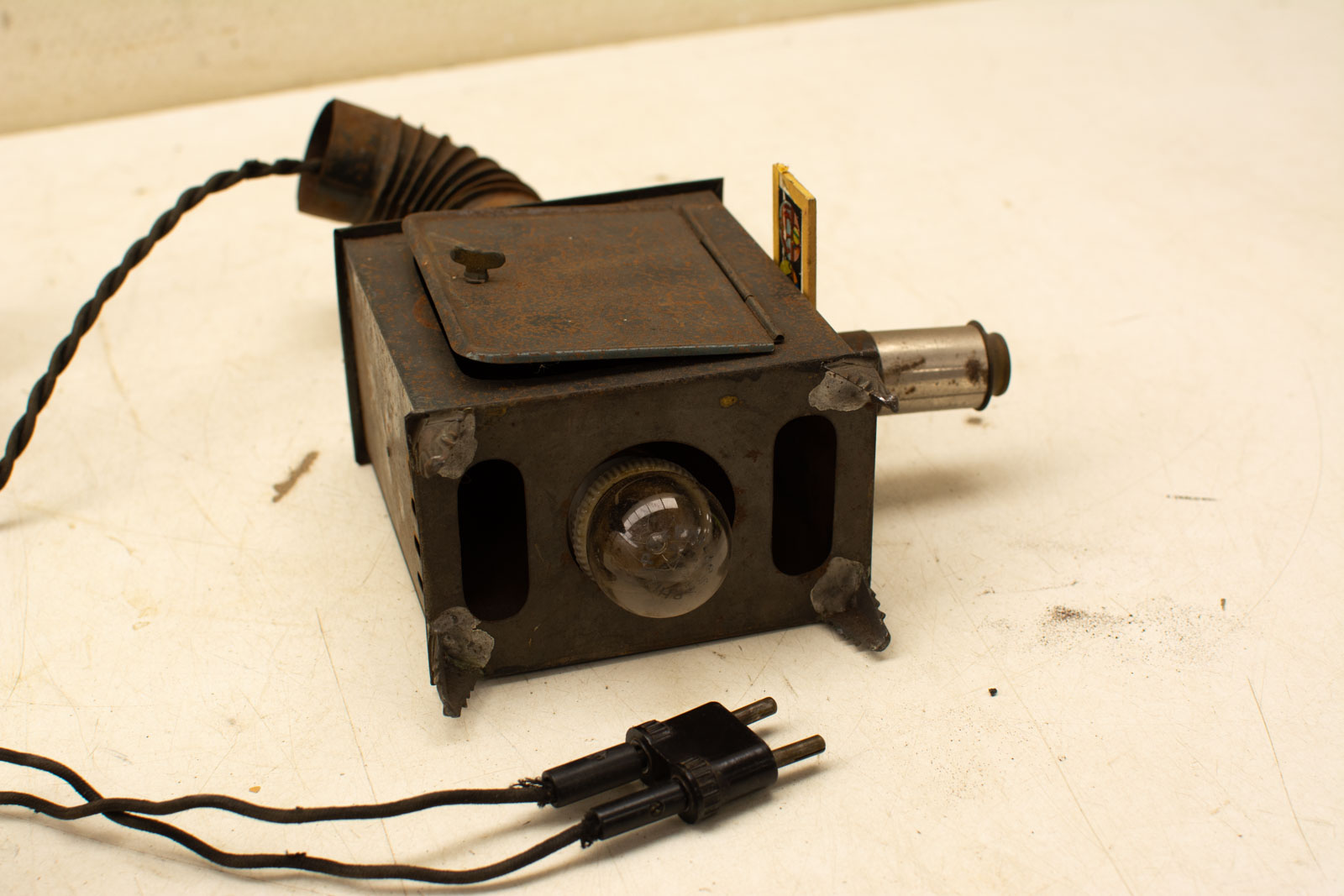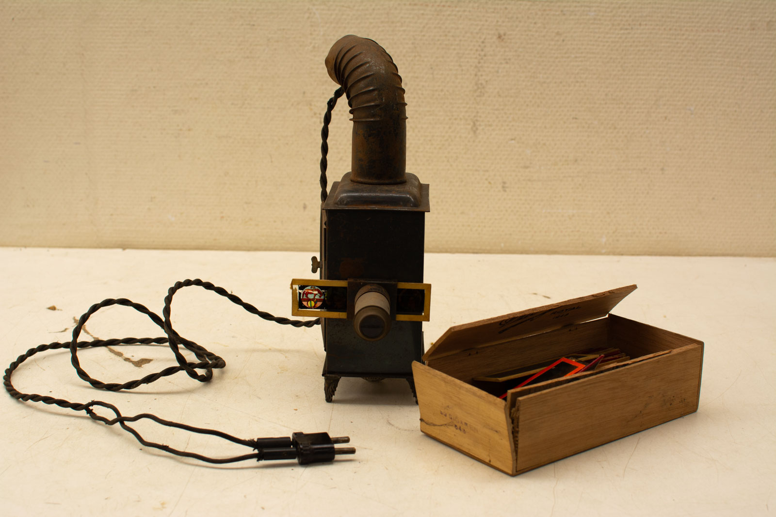met verschillende antieke glazen toverlantaarn platen de toverlantaarn heeft roest er moet een nieuwe kabel aan diepte 12,5 cm hoog gemeten met buis 29 cm