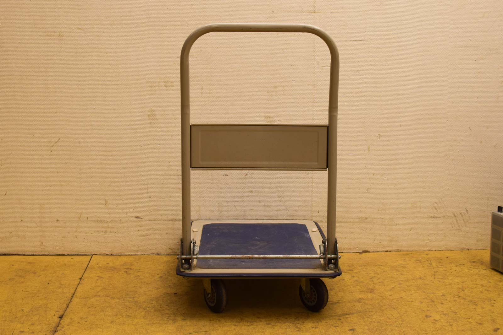 de transportwagen is gebruikt heeft gebruikssporen maar rolt nog hoogte gemeten zonder hendel 13 cm