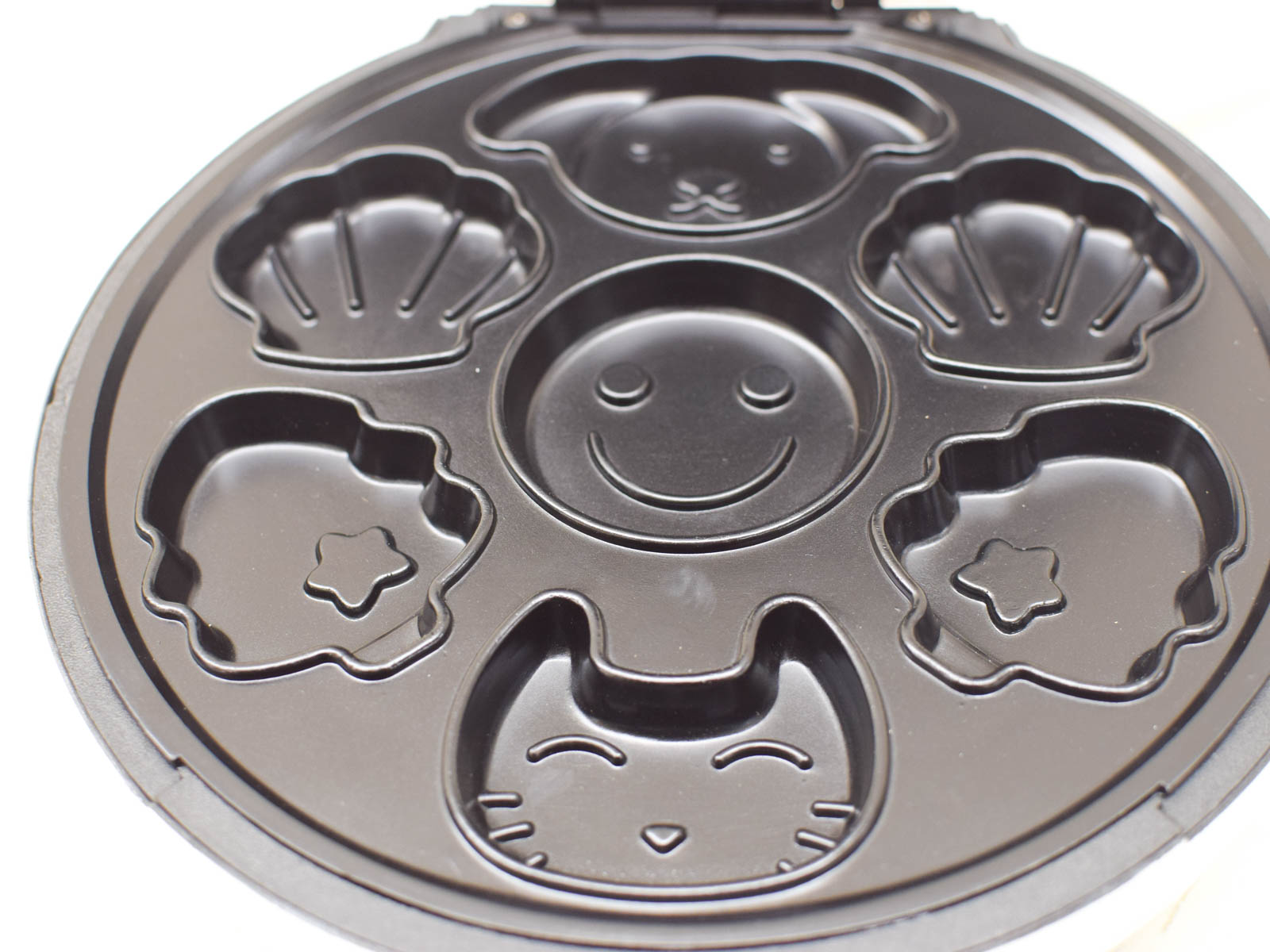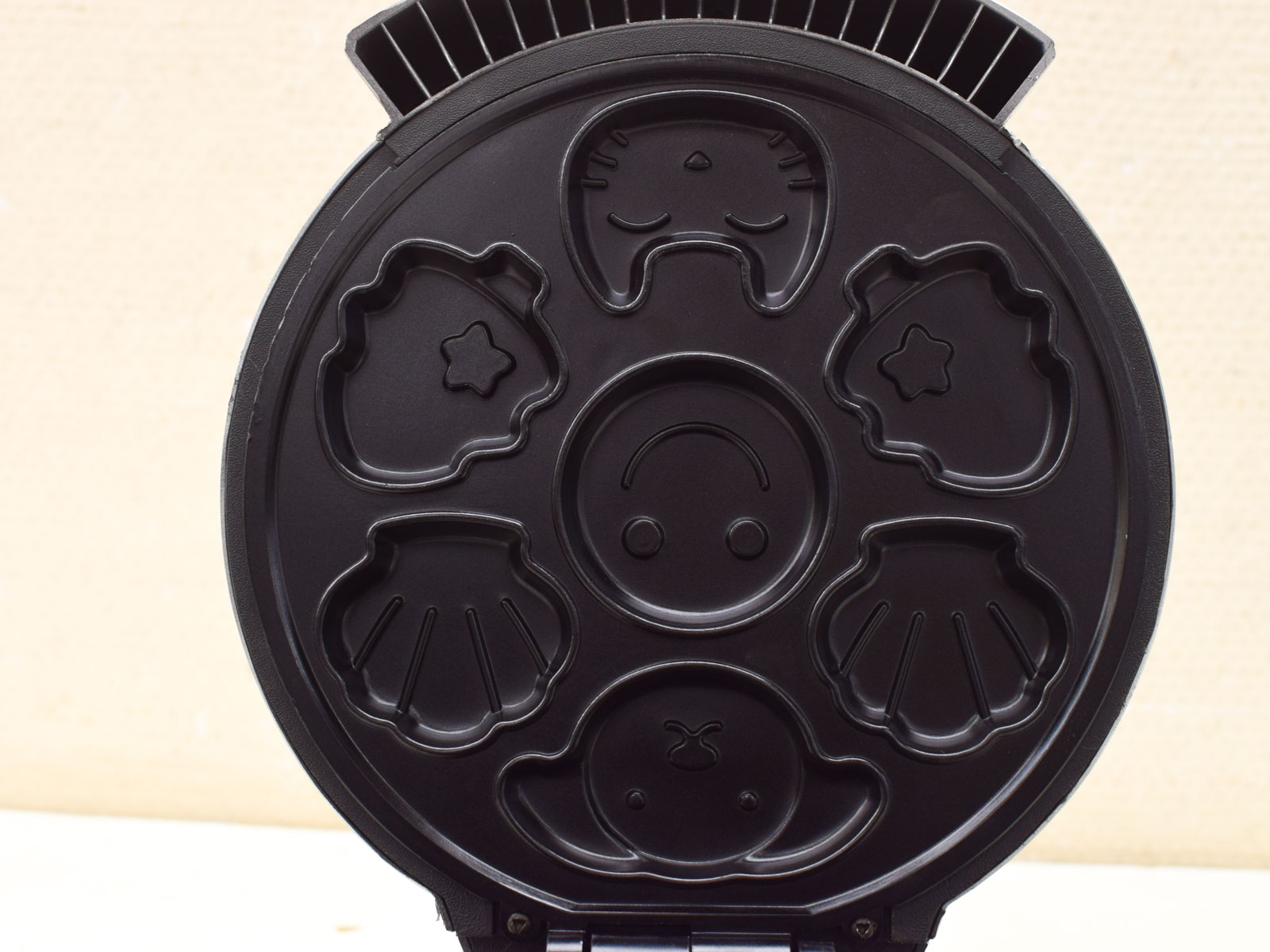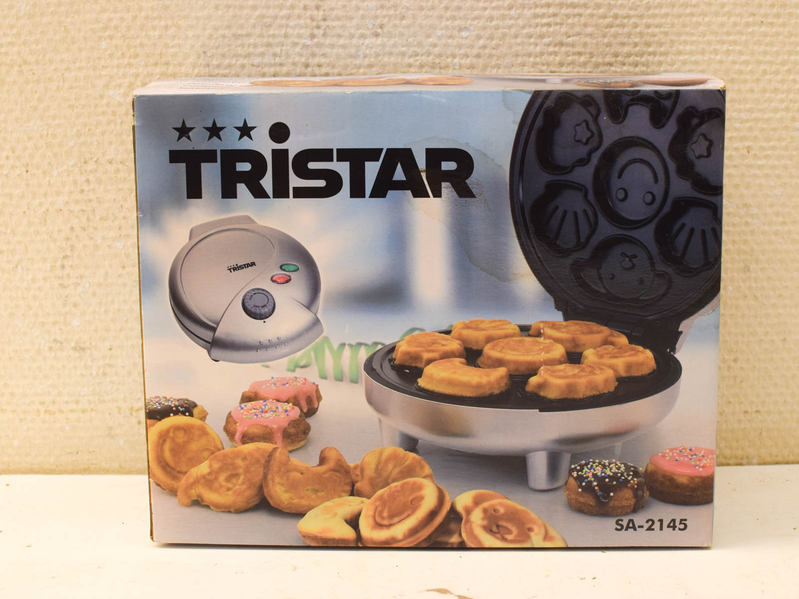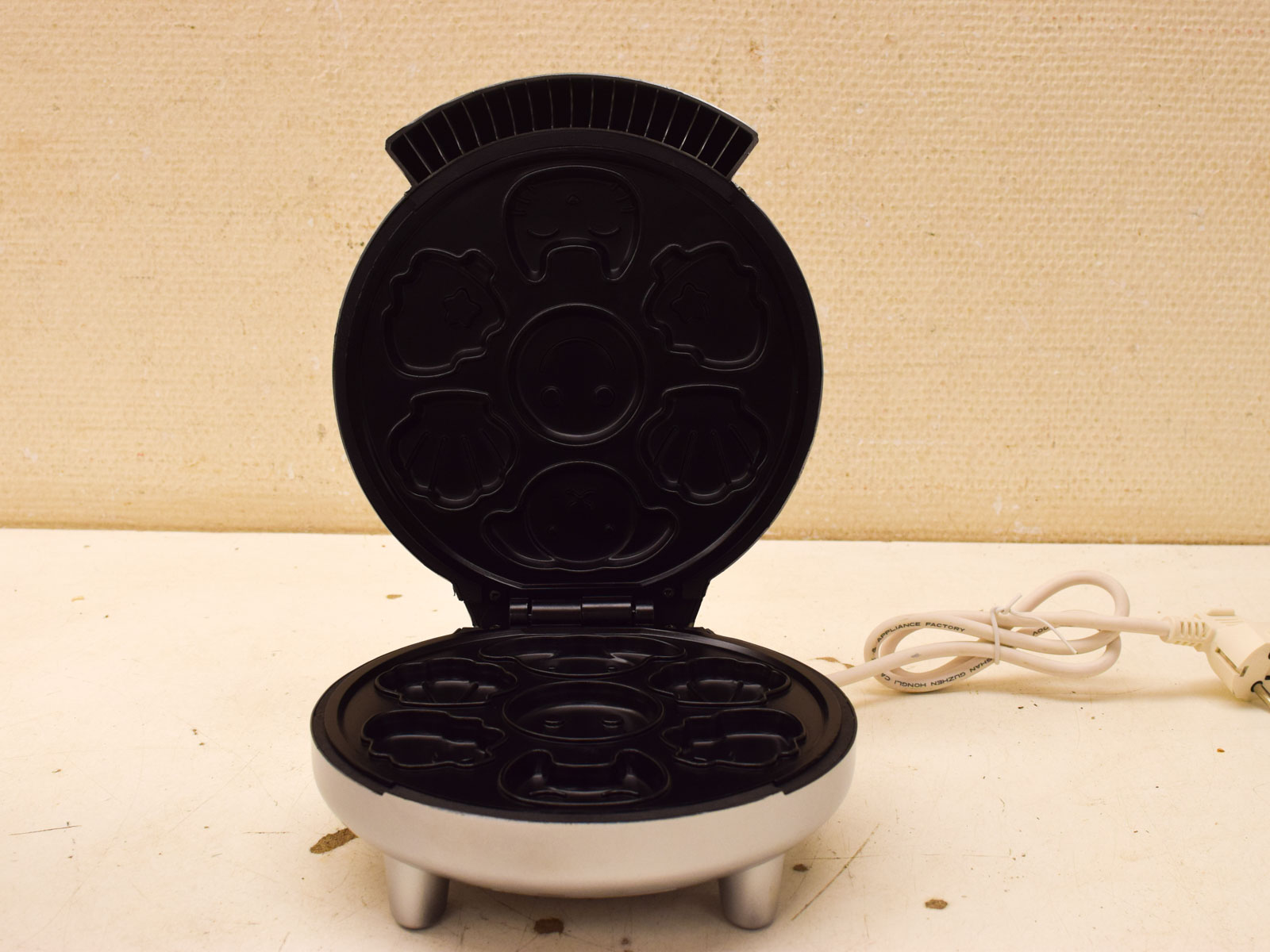 Dit is een Tristar koekjesmaker (model 51402) waarmee je snel leuke vormde koekjes bakken. De Tristar koekjesmaker heeft een wit kunststof behuizing met twee verwisselbare bakplaten: een zilvergrijze plaat met dierengezichtjes bovenop en een zwarte plaat met dezelfde grappige dierenmotieven. Je kunt dus beide soorten tegelijk bakken.